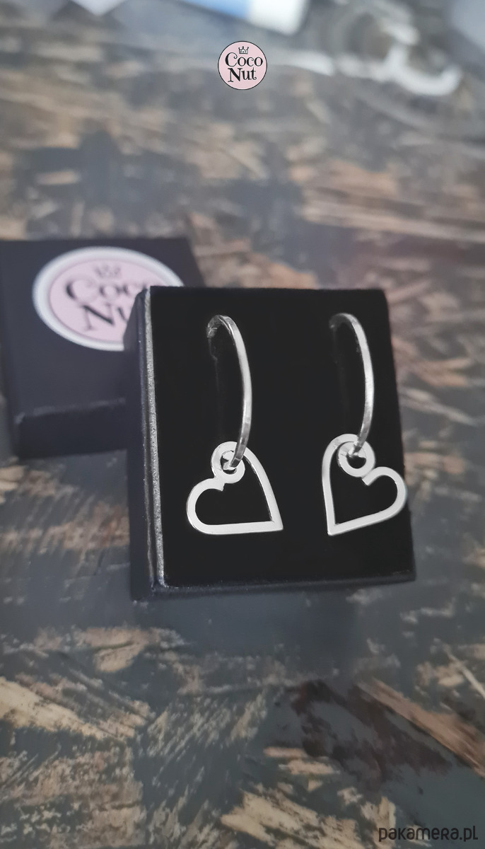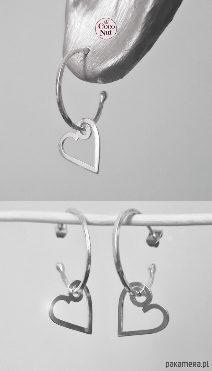 Kolczyki kółka z ruchomymi sercami, serca ok. 1,5cm, koła (niepełne, na sztyft, lekko fakturowane) ok. 2 cm.