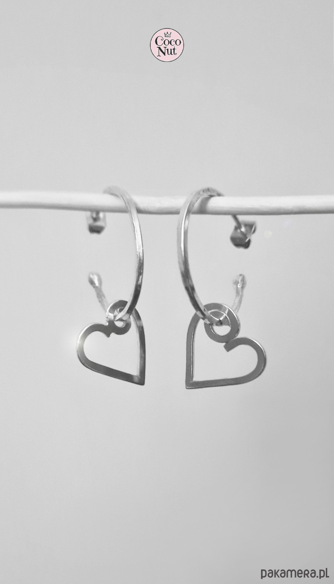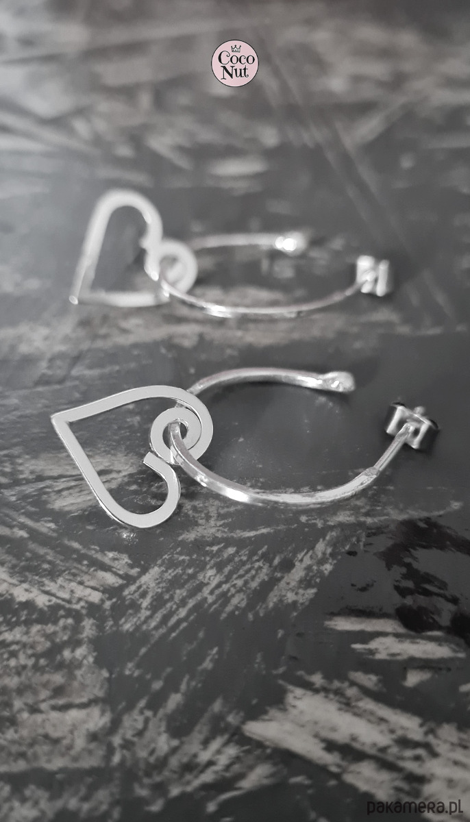 Kolczyki kółka z ruchomymi sercami, serca ok. 1,5cm, koła (niepełne, na sztyft, lekko fakturowane) ok. 2 cm.
