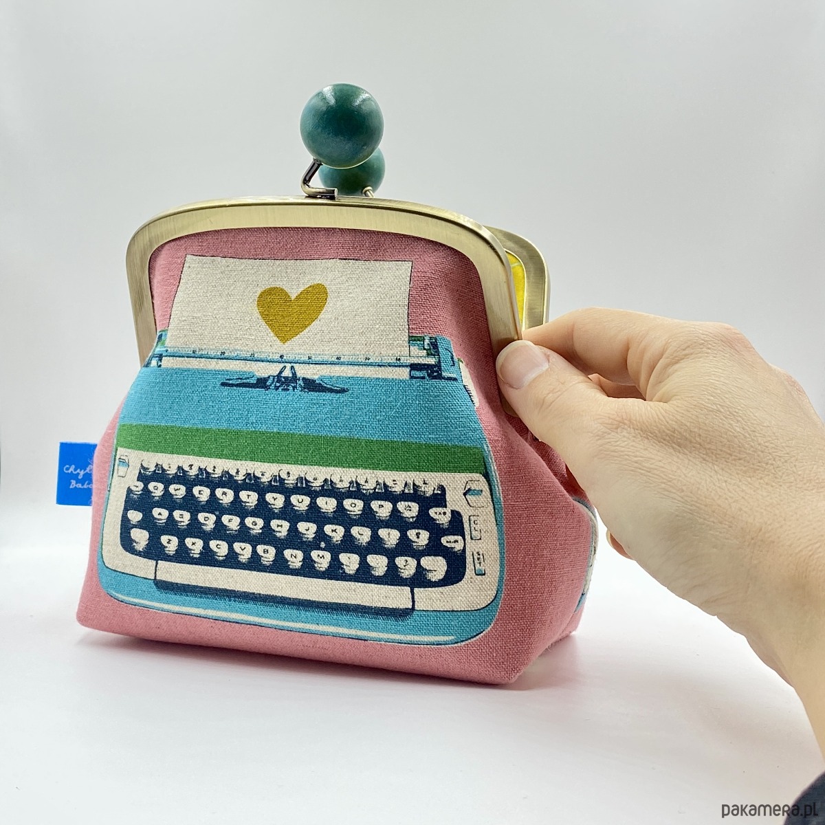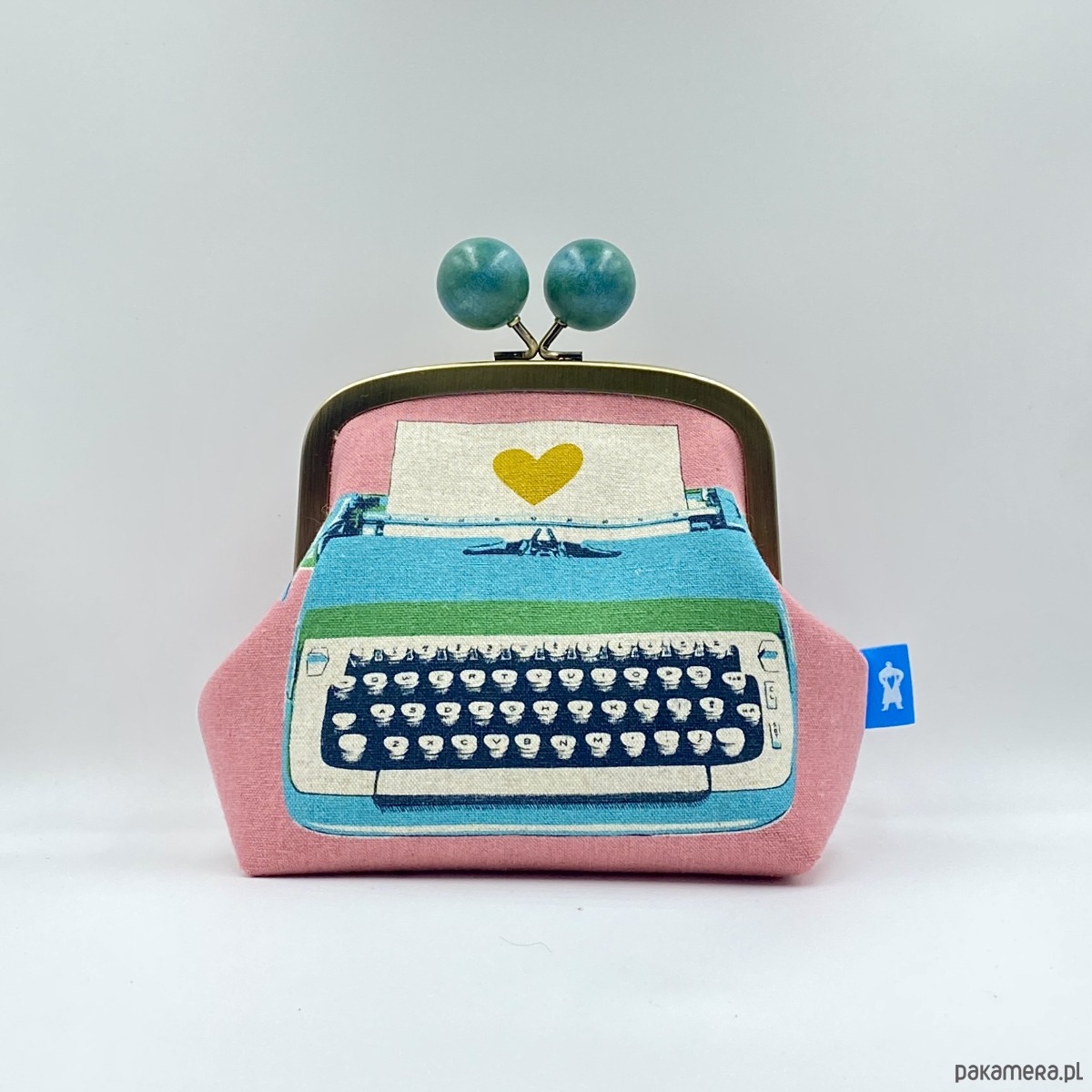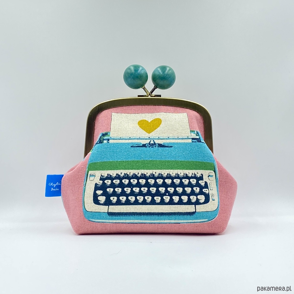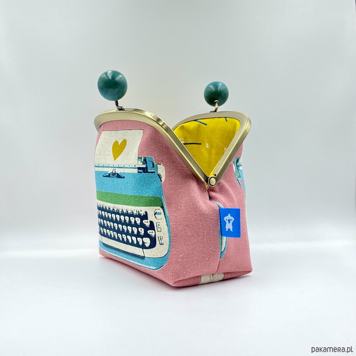 „Love Letter” to torebka / kosmetyczka ze wzmocnionego płótna z nadrukiem maszyny do pisania vintage. Od wewnątrz znajduje się musztardowa podszewka w szczoteczki. Błękitna metka.