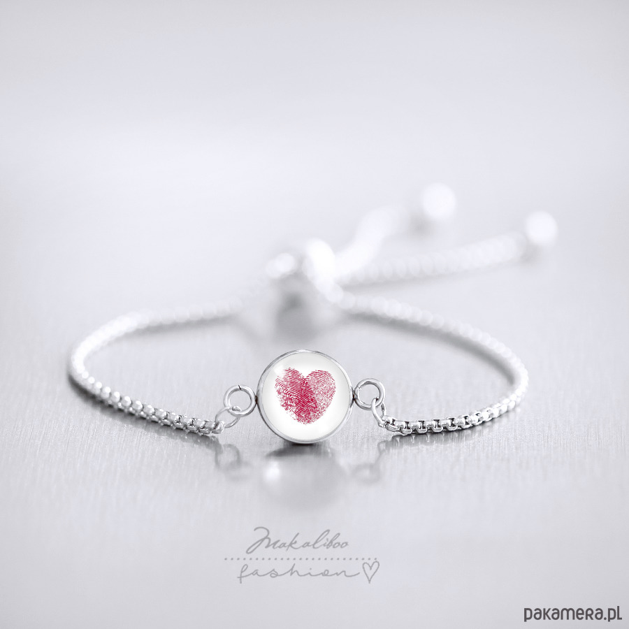 Grafika została ukryta pod 10 mm wypukłym szkiełkiem. Silikonowy zacisk pozwala dostosować bransoletkę do każdego nadgarstka
