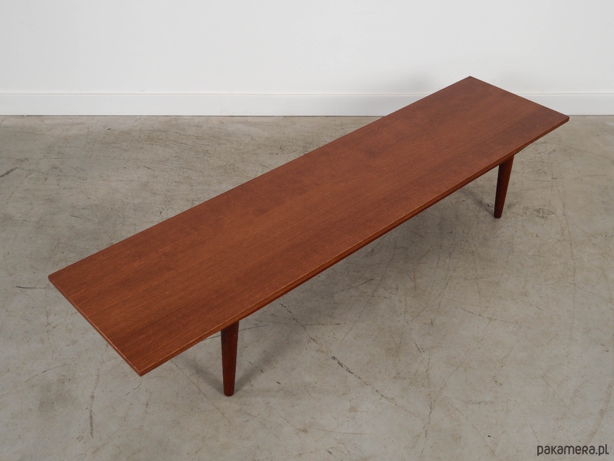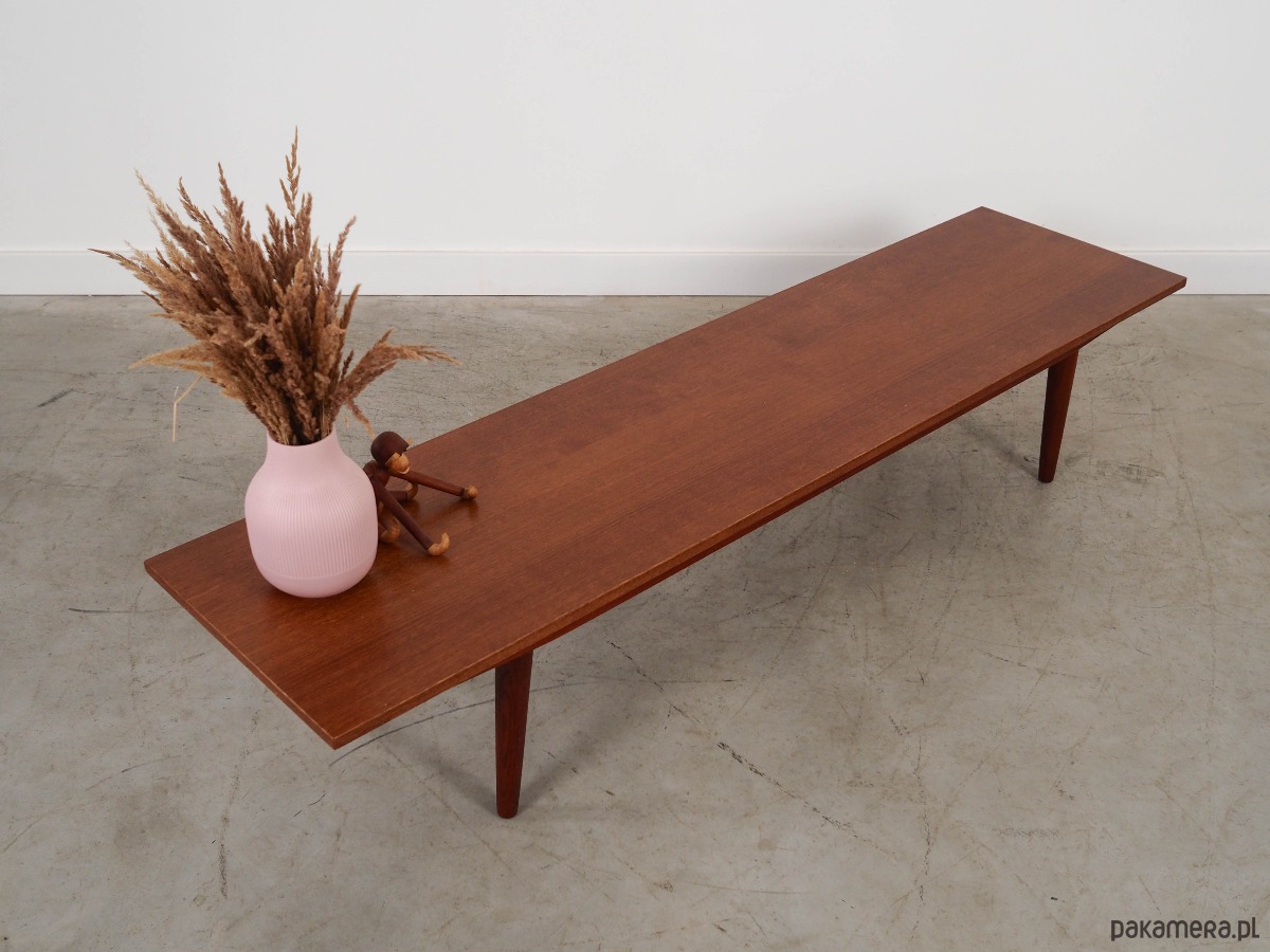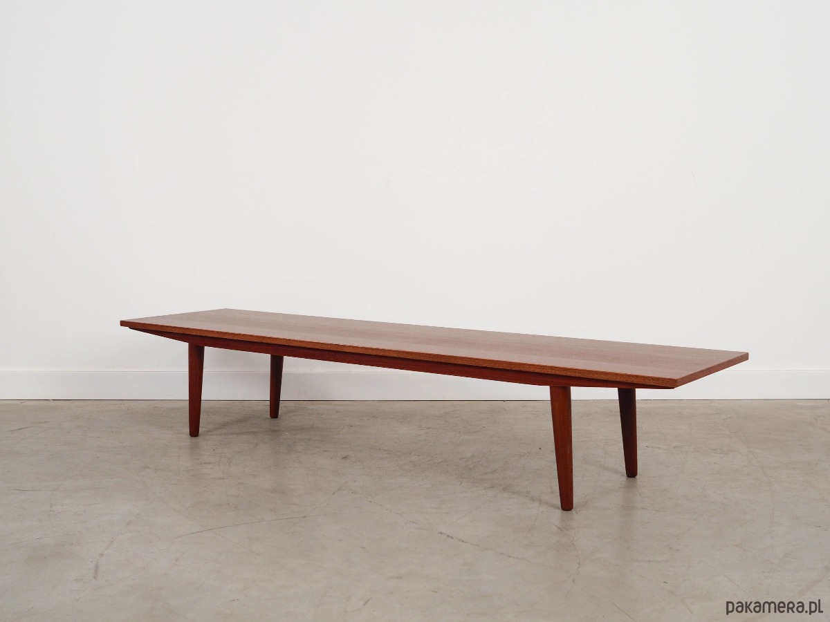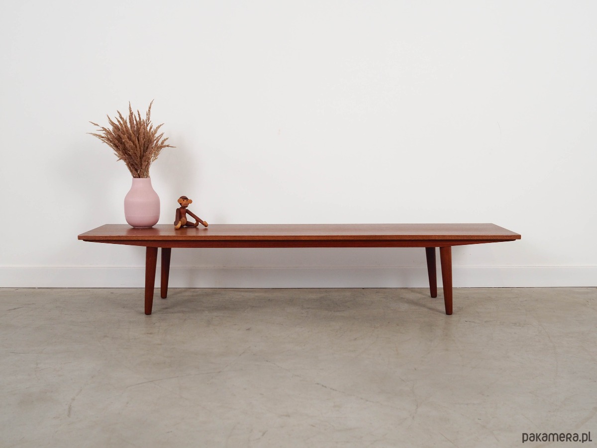 Konstrukcja pokryta jest fornirem tekowym. Nogi zostały wykonane z litego drewna. Powierzchnia po odświeżeniu.