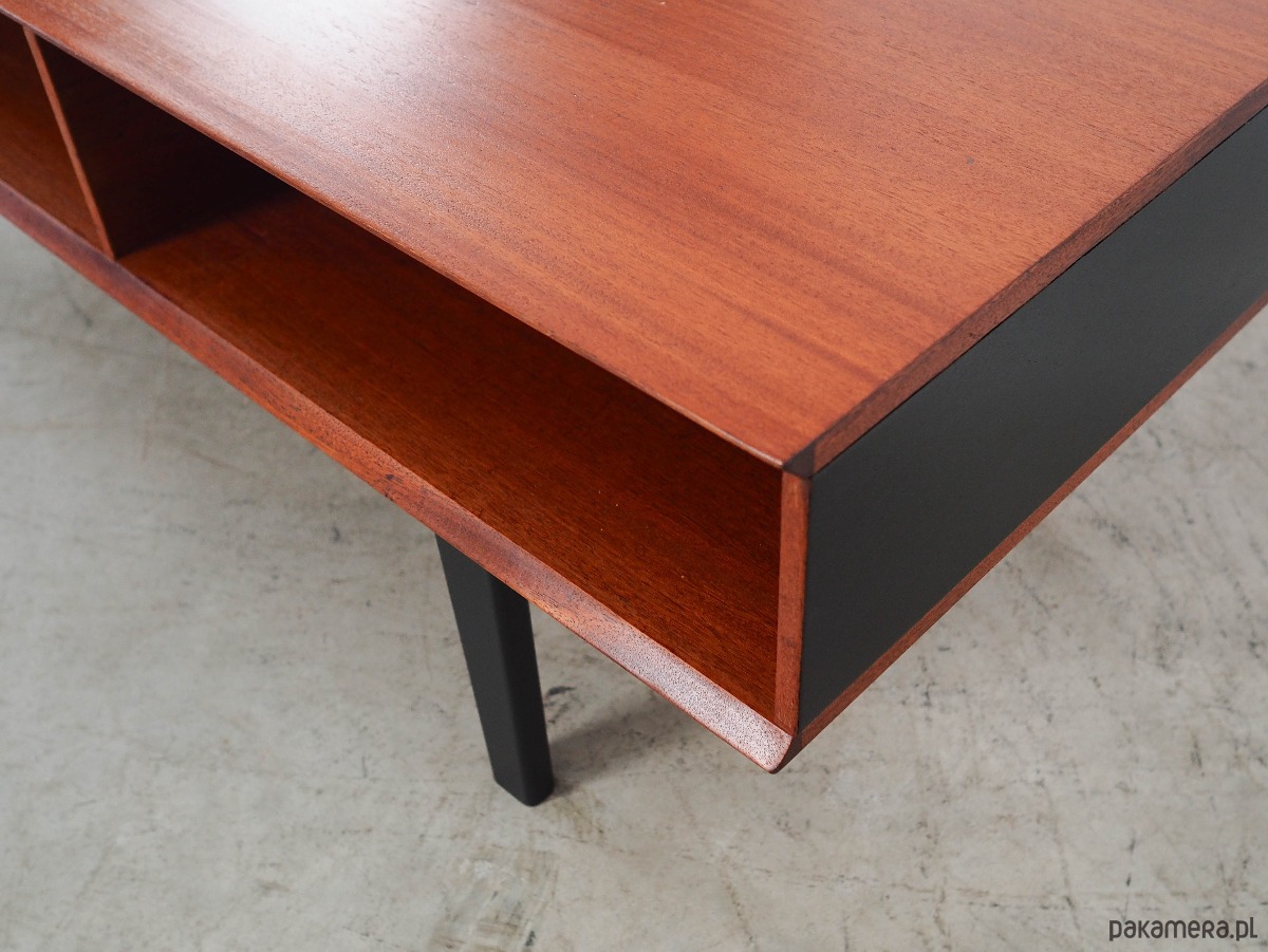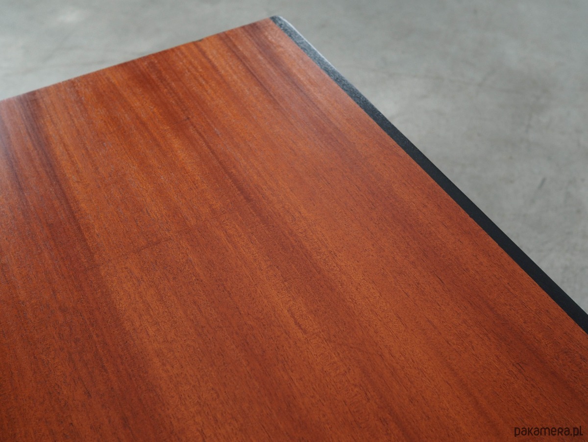 Konstrukcja pokryta jest fornirem tekowym. Nogi zostały wykonane z litego drewna. Powierzchnia po odświeżeniu. Mebel posiada trzy otwory w płycie tylnej, przeznaczone na kable.