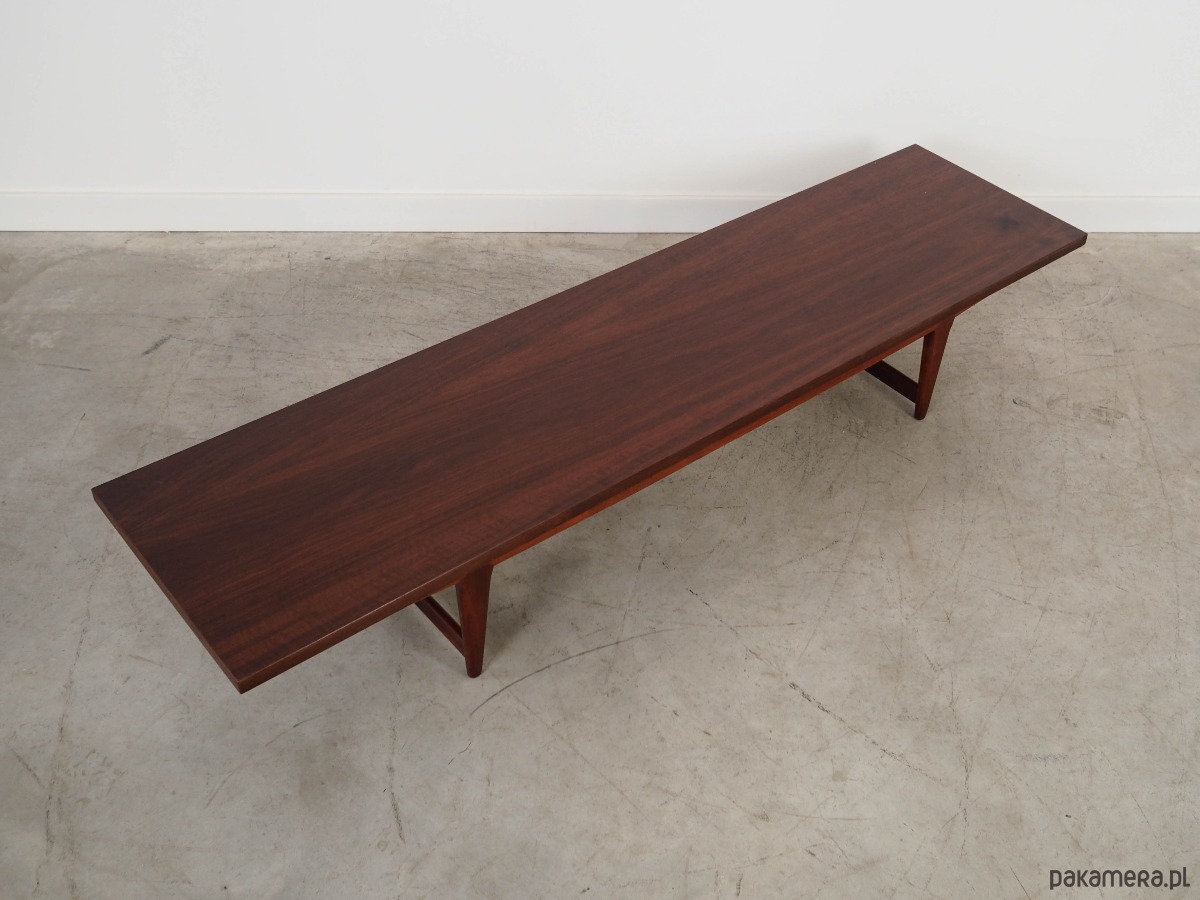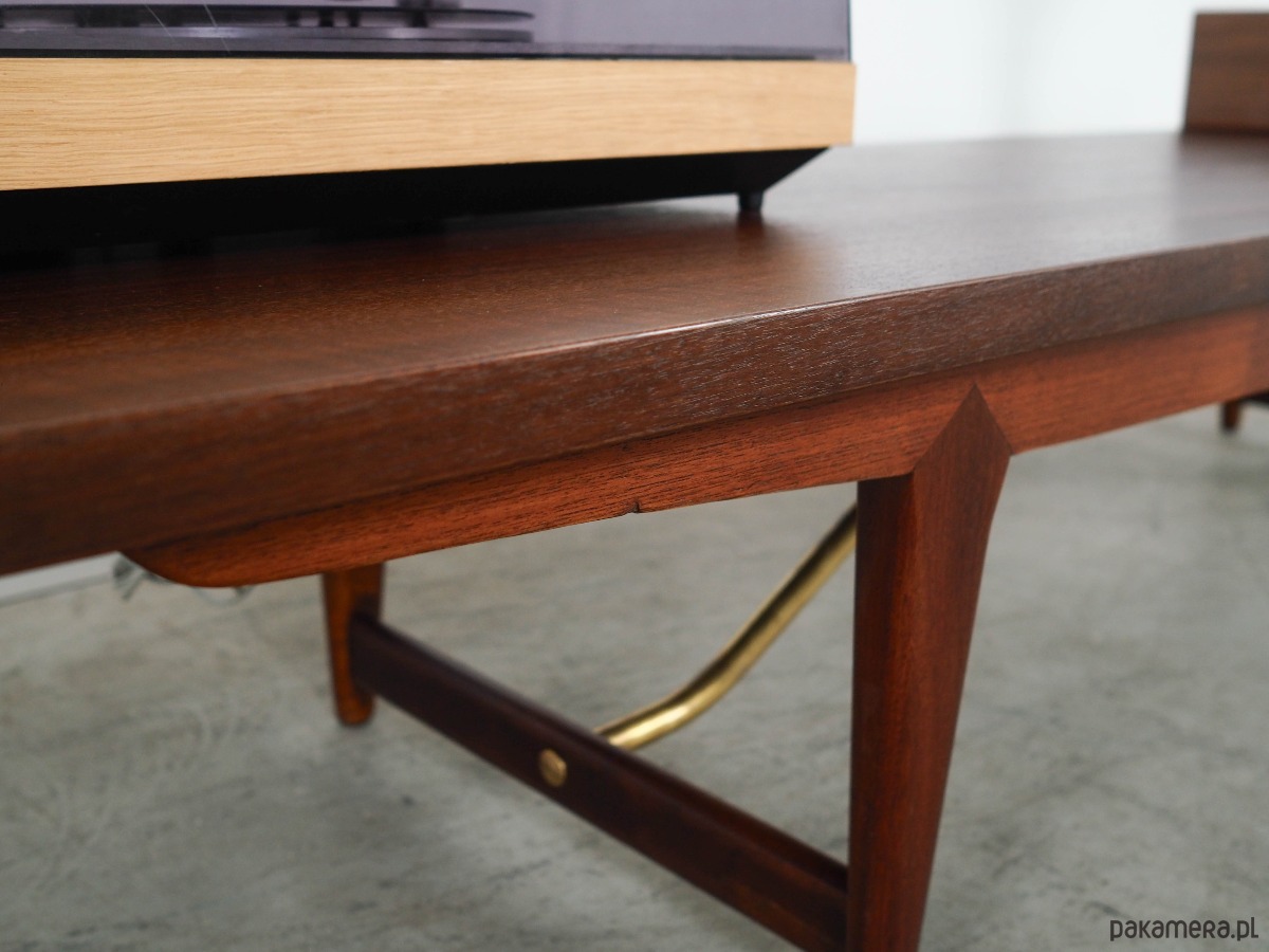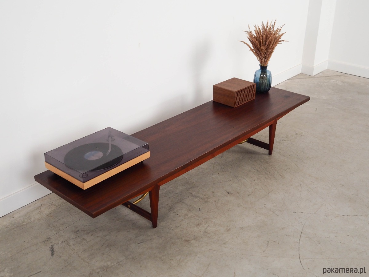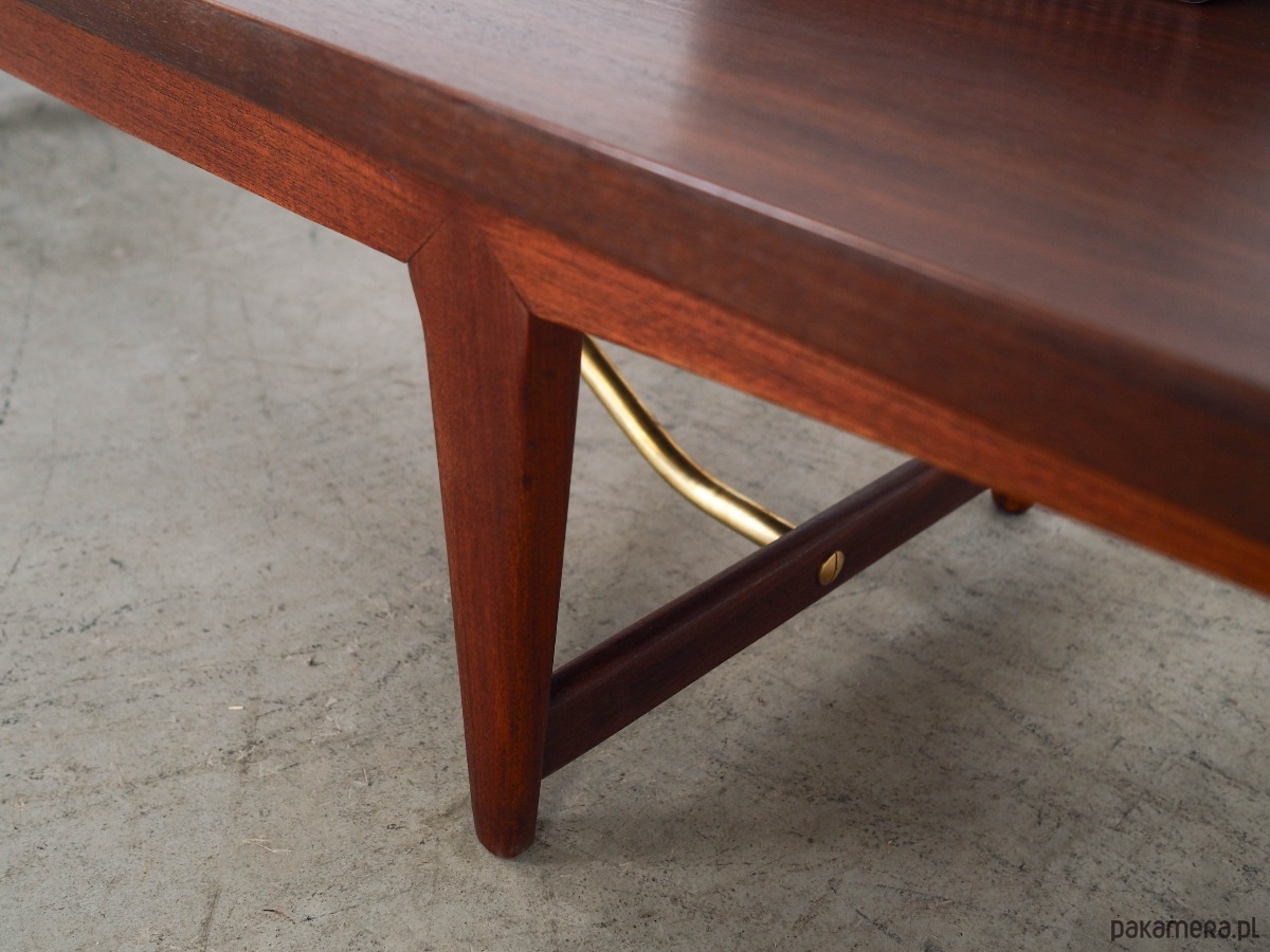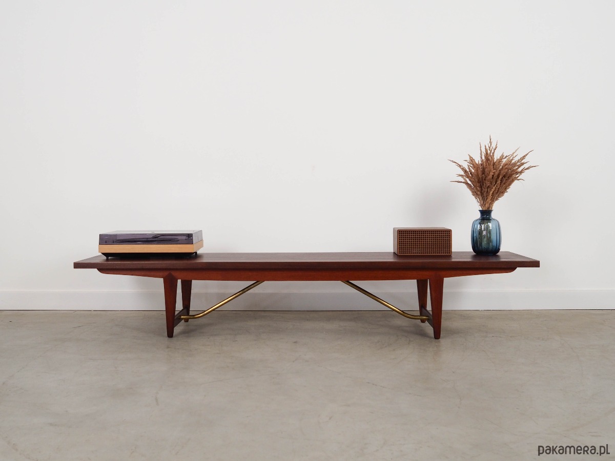 Konstrukcja pokryta jest fornirem tekowym. Nogi zostały z litego drewna oraz metalu. Powierzchnia po odświeżeniu.