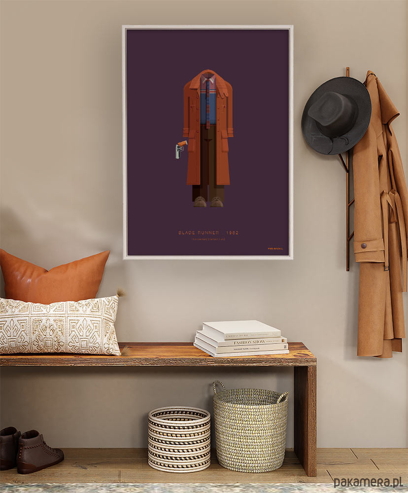 Plakat z autorską grafiką inspirowany filmem Łowca Androidów (Blade Runner), reż. Ridley Scott. Przedstawia kostium Ricka Deckarda, w którego w filmie wcielał się niezapomniany Harrison Ford. Kultowy film na podstawie genialnej książki Philipa K. Dicka do dziś uwodzi swą antyutopijną tajemniczością. Plakat dla każdego fana i nie tylko.