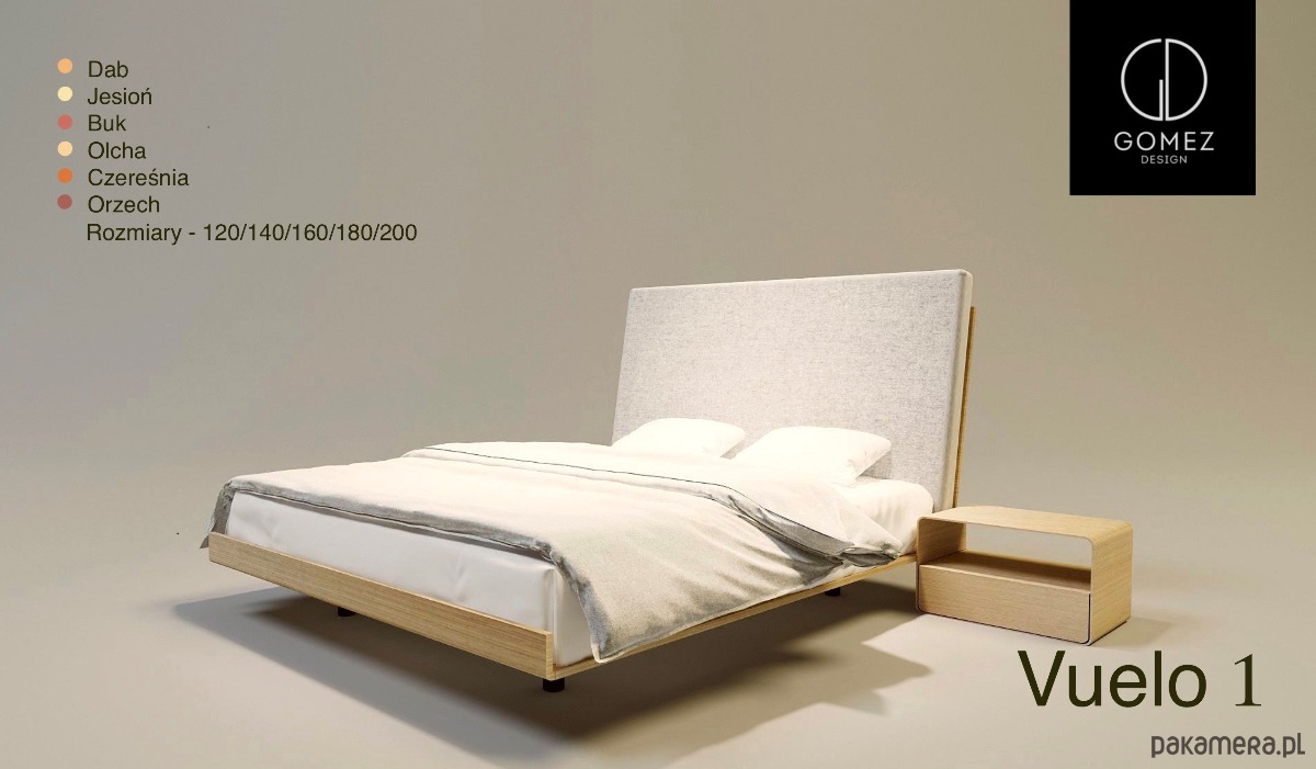 Niezwykle lekka forma i futurystyczny design to cechy charakterystyczne modelu Vuelo. Do jego stworzenia zostały użyte wyłącznie wyselekcjonowane, najlepszej klasy materiały. Jeśli chcesz w pełni spersonalizować ten projekt, możesz wybrać gatunek drewna, z którego wykonamy dla Ciebie łóżko. Dostępne są: dąb, jesion, olcha, buk, czereśnia lub orzech. Aby dopasować szerokość łóżka do pomieszczenia, liczby śpiących w nim osób oraz preferencji, możesz zdecydować się na wariant od 120x200 do 200x200 cm.
