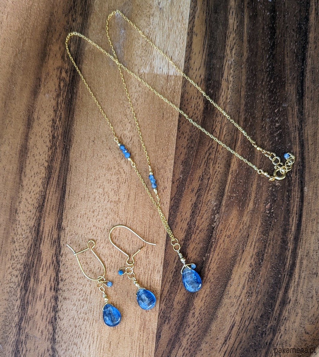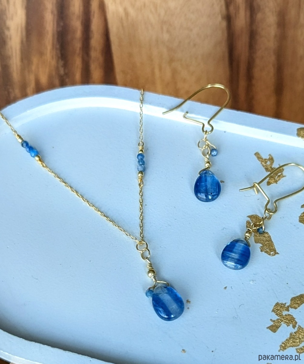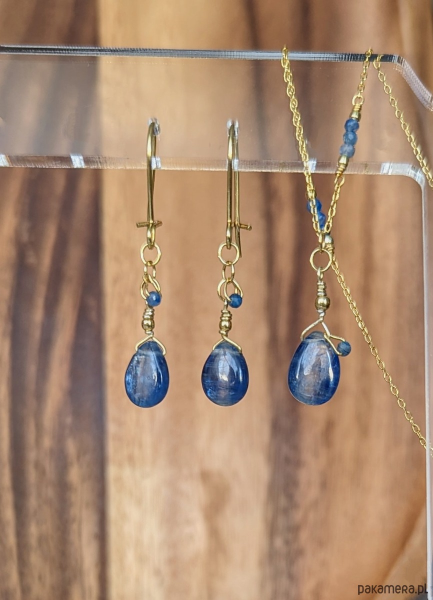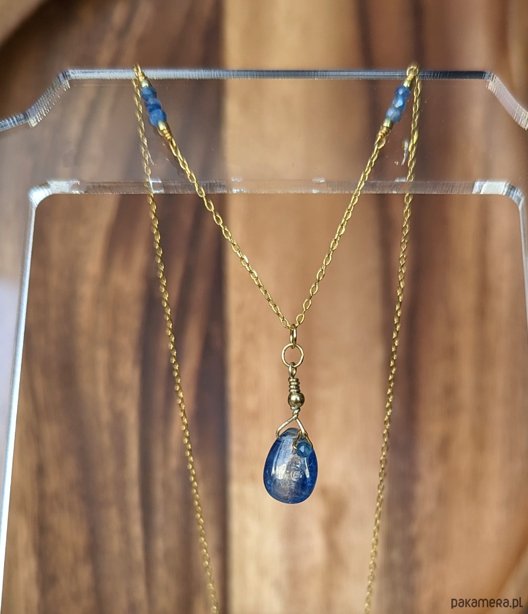 Naszyjnik na bazie łańcuszka z wplecionymi kamieniami kianitu oraz piękną, świetlistą zawieszką (brioletka kianitu). Wykonany ze złoconego srebra. Do kompletu polecam kolczyki .