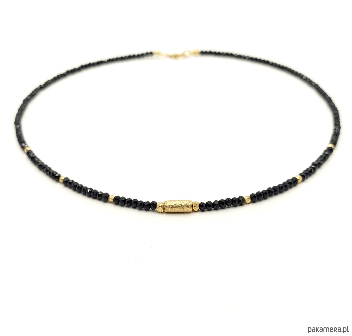 Naszyjnik wykonany z fasetowanych oponek spinela, pięknie odbijającego światło. Kamienie są równe, precyzyjnie oszlifowane, układają się w jednolity sznur. Na tle ich idealnej czerni widoczny jest symetryczny układ złoconych bryłek srebra. Całość elegancka w swojej prostocie. Idealny do połączeń z innymi naszyjnikami. Must have w każdej szkatułce.
