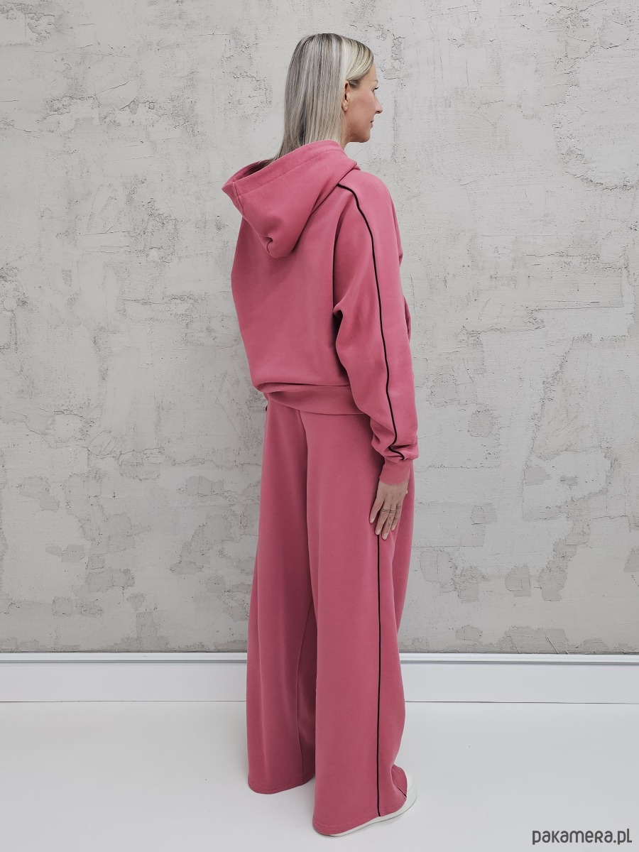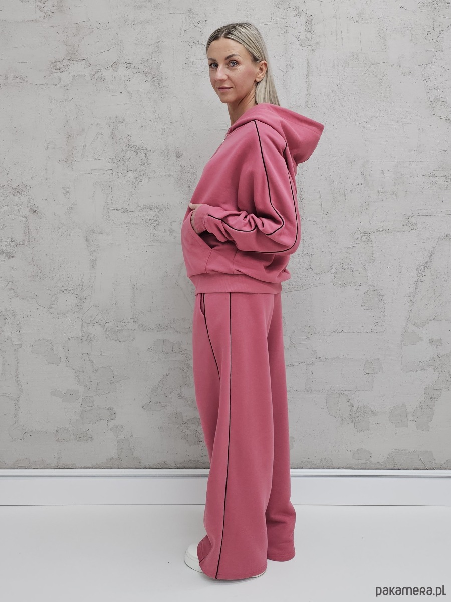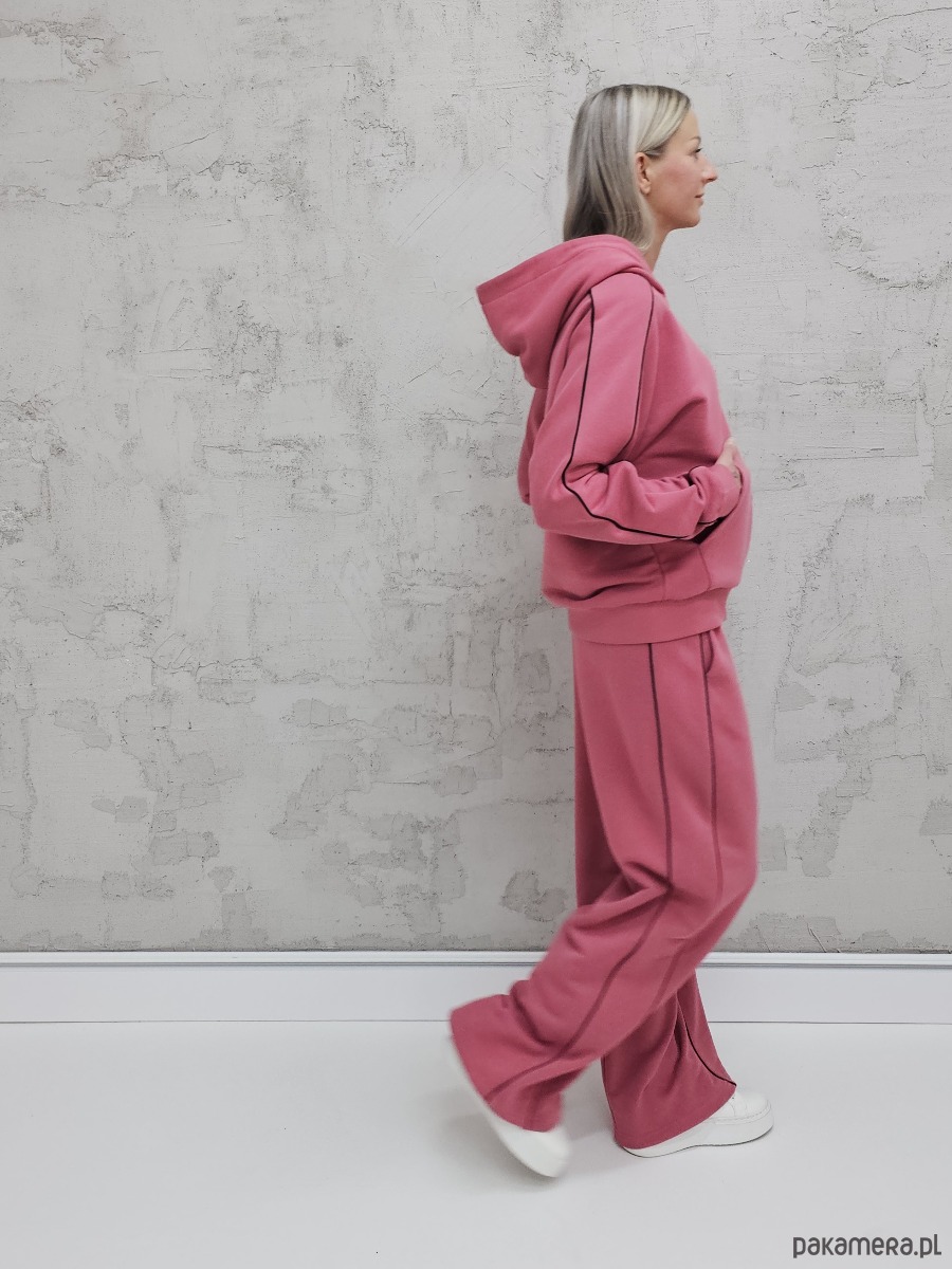 OPIS PRODUKTU- Oversizowy komplet Lucia uszyty z naszego sygnowanego materiału superSOFT™. Komplet obejmuje komfortową bluzę, o luźnym kroju, rozpinana z kapturem i kieszenią na przodzie i ozdobnymi lamówkami na rękawach. Plus spodnie z szerokimi nogawkami i lamówkami na bokach. W spodniach elastyczny ściągacz z gumą i sznurkiem do płynnej regulacji obwodu.