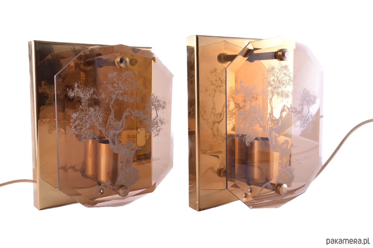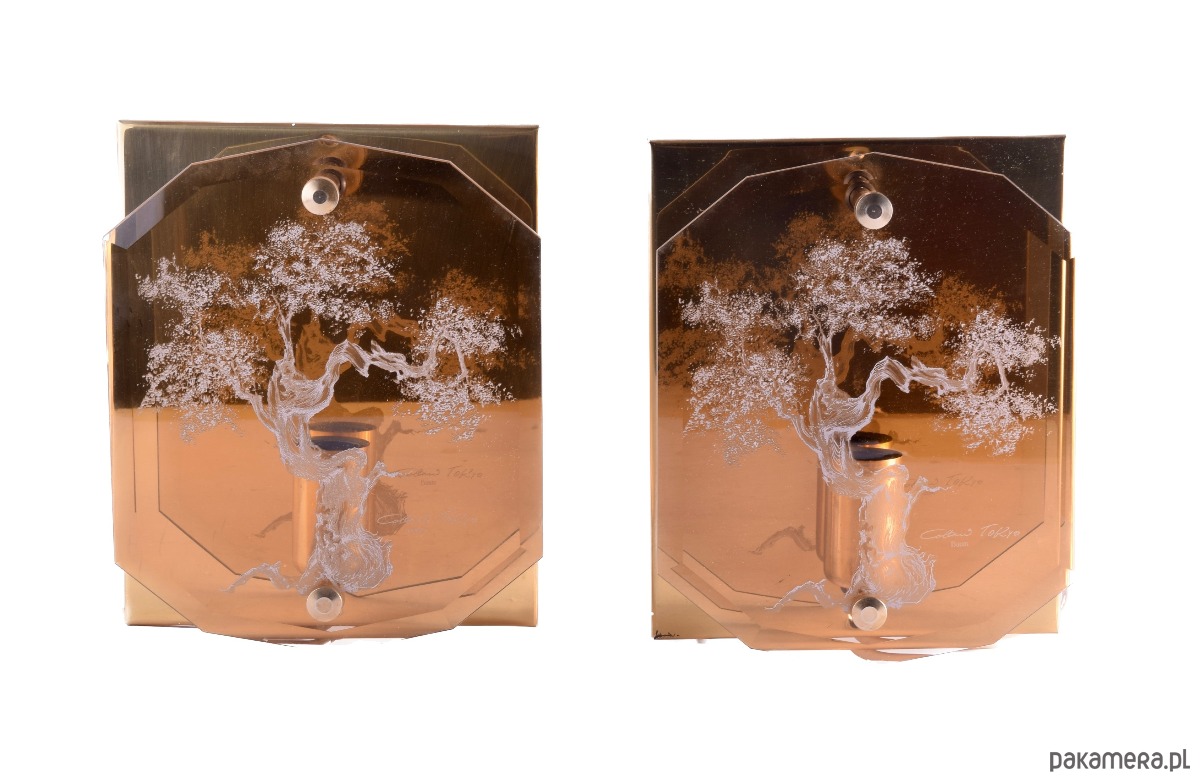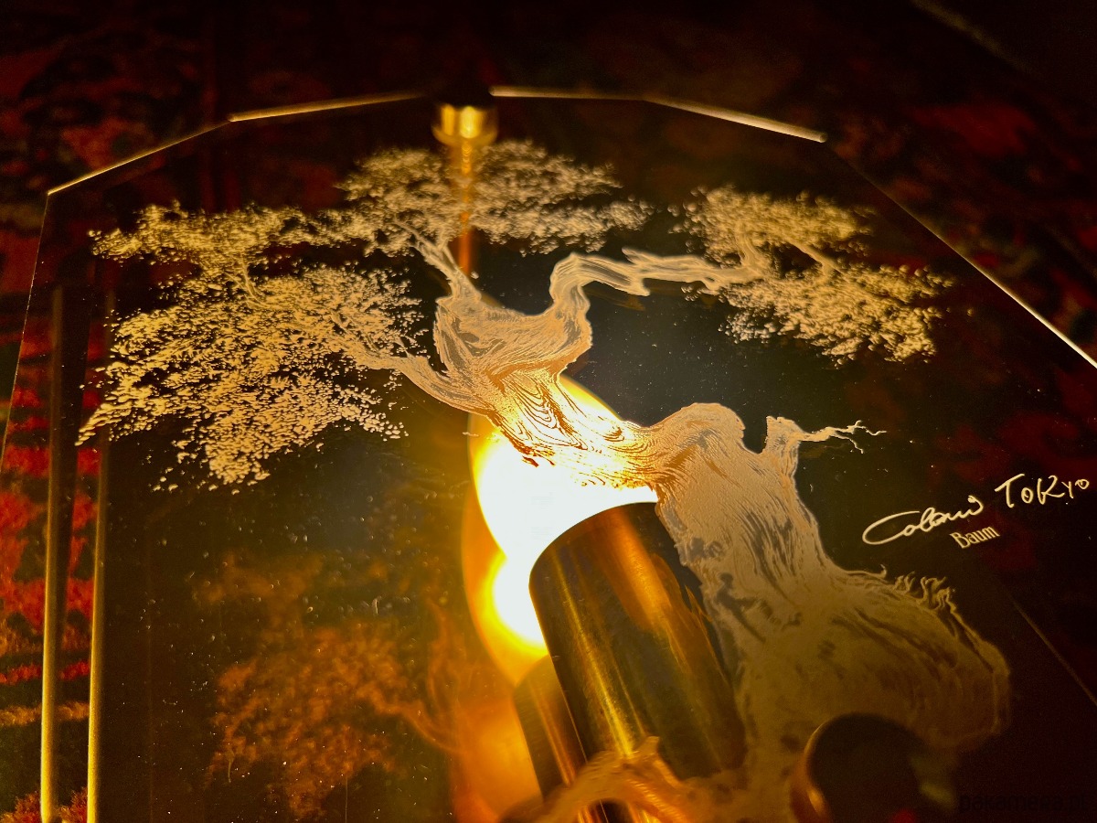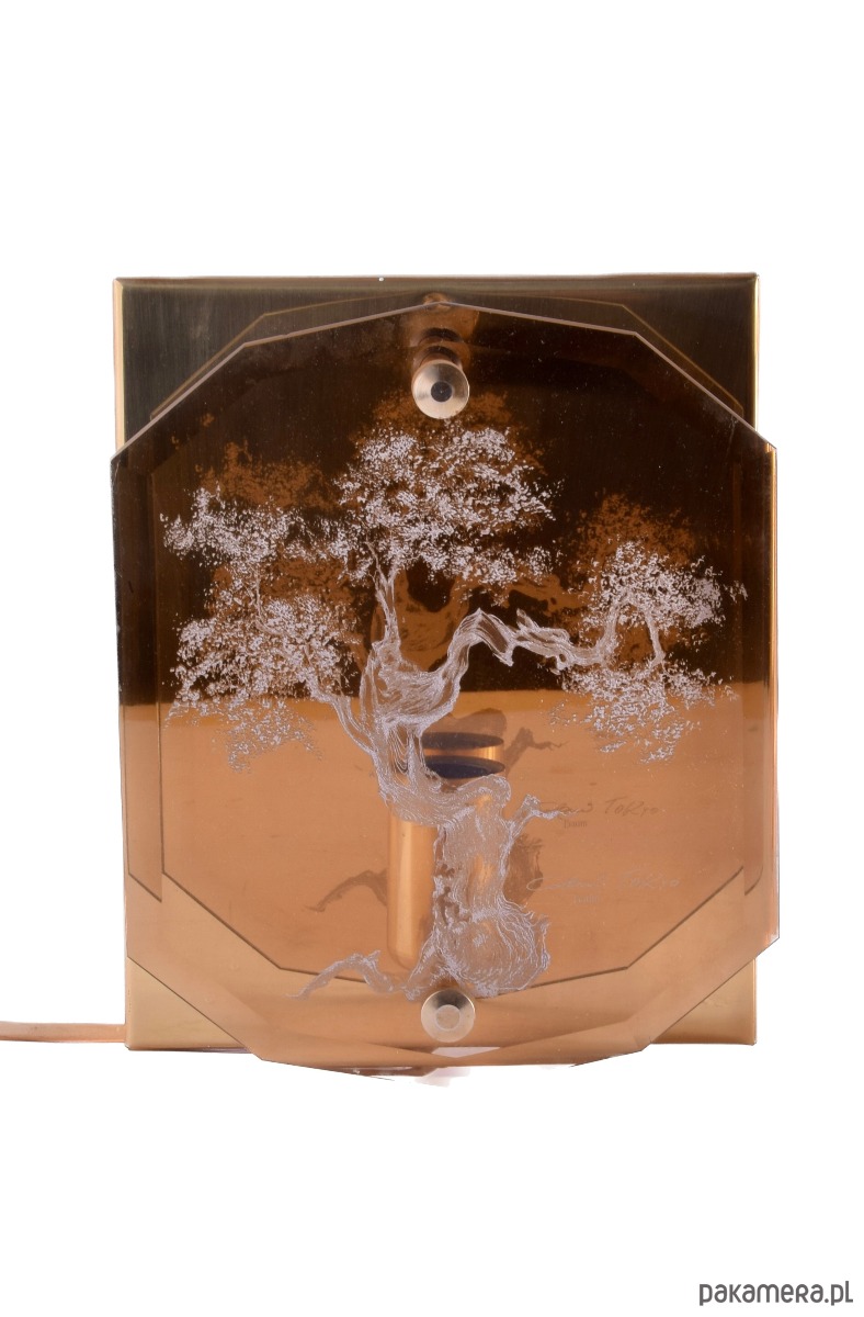 Front wykonany jest z barwionego szkła z trawionym motywem drzewa, dającym niezwykle subtelny efekt przestrzenny. Z tyłu znajduje się mosiężna blacha odbijająca światło, która wzmacnia ciepły, nastrojowy efekt iluminacji.