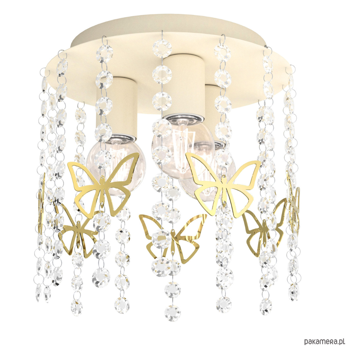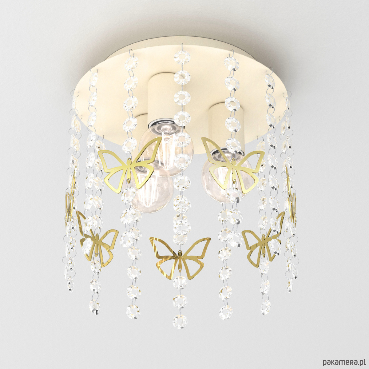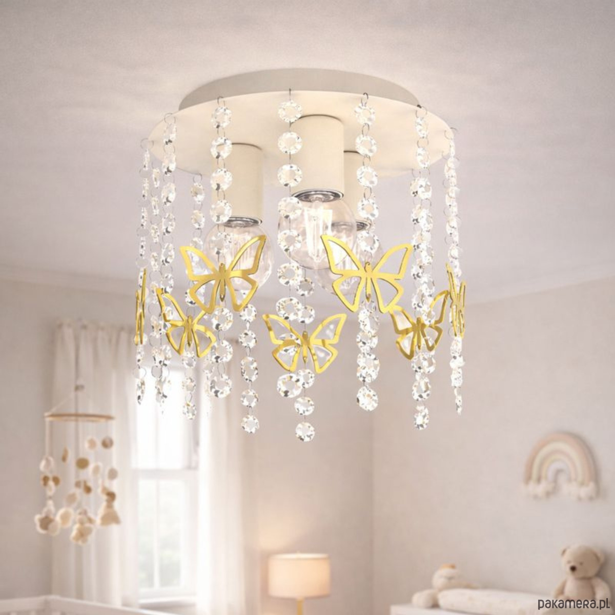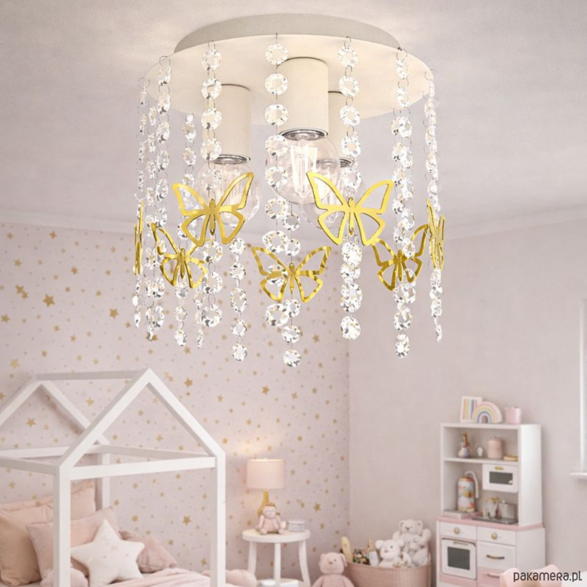 Urocza lampa sufitowa do pokoju dziecięcego, która łączy funkcjonalne oświetlenie z bajkowym designem. Trzy punkty świetlne zapewniają odpowiednią ilość światła, a dekoracyjne kryształki oraz złote zawieszki w kształcie serduszek lub motylków tworzą magiczną atmosferę w dziecięcym wnętrzu.