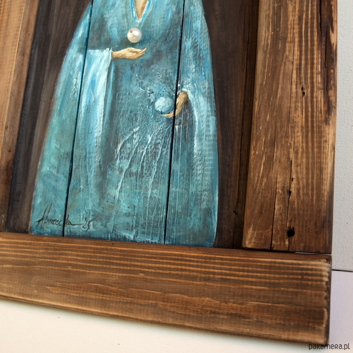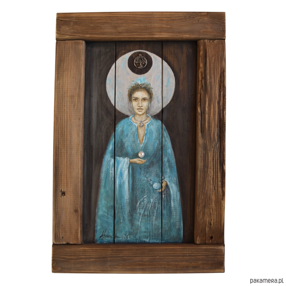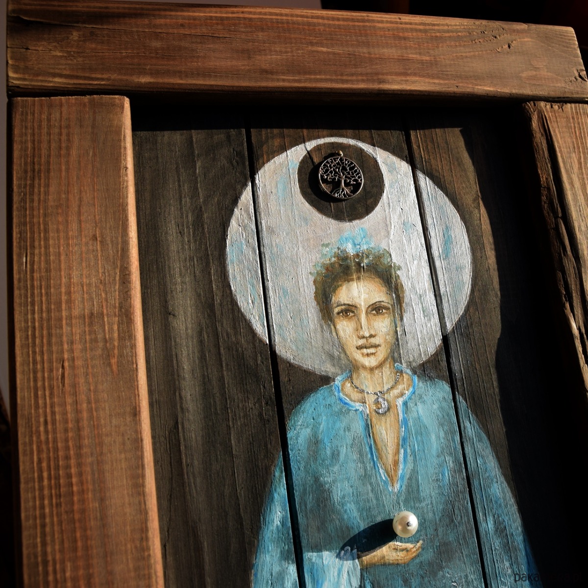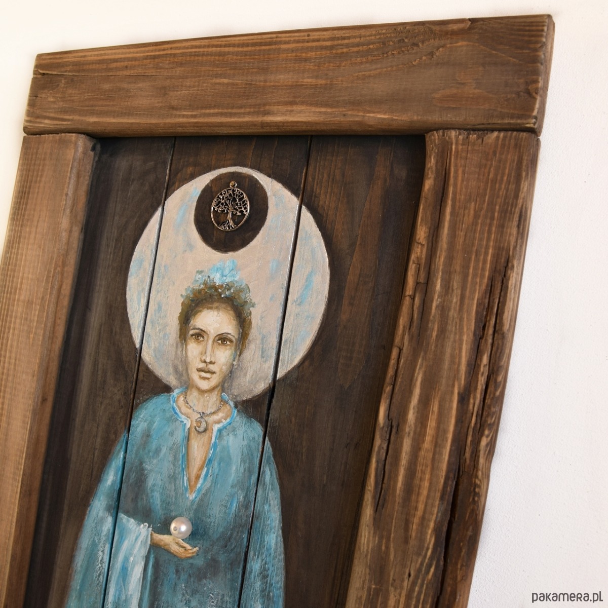Obraz malowany na starych deskach, z ramką wykonaną również ze starych desek. Tło i rama są bejcowane, postać malowana farbami akrylowymi, w projekcie wykorzystany jest również metalowy dekor z motywem drzewa życia oraz stary koralik. W deskach celowo zostawione są niedoskonałości w postaci nierówności, pęknięć, otworów po gwoździach, by zachować ich historię, wykorzystaniem takich nadżartych czasem materiałów nawiązuję do filozofii wabi-sabi.