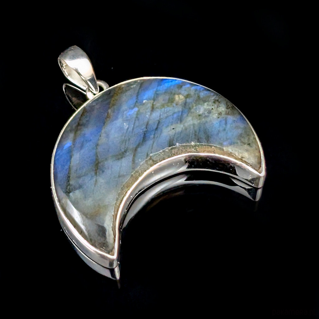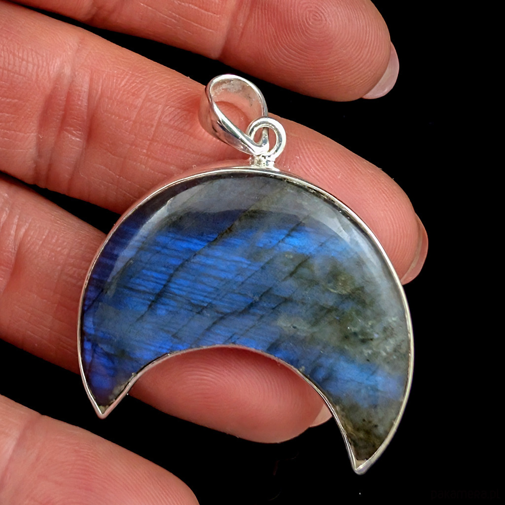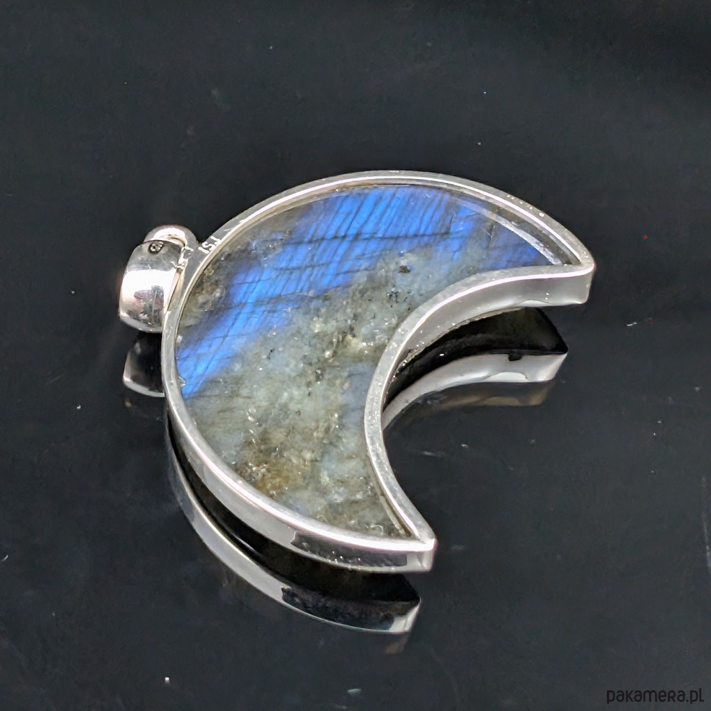 Oryginalny wisiorek ze srebra próby 925 oraz fasetowanego labradorytu. Długość 42 mm. Wymiary 37 x 27 mm. Waga 14,8 g. Wykonany przez dostawcę kamieni, polecam, piękny kamien