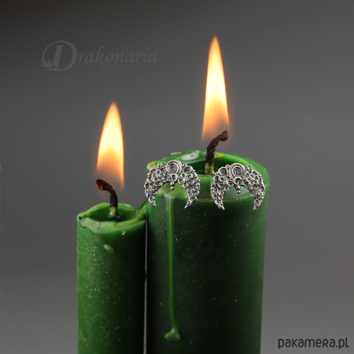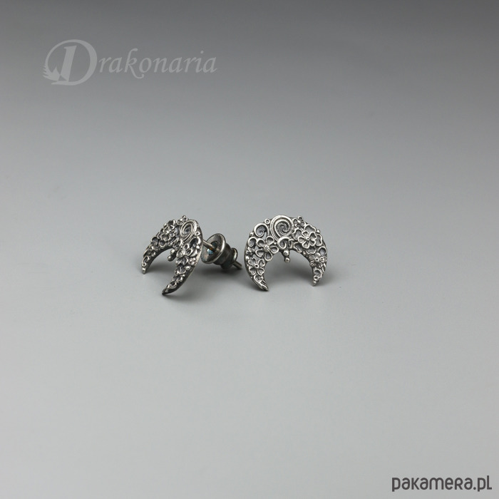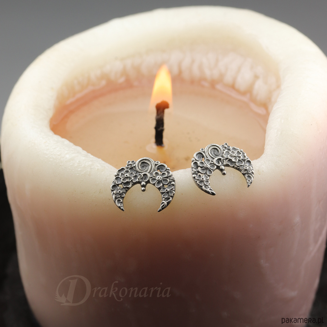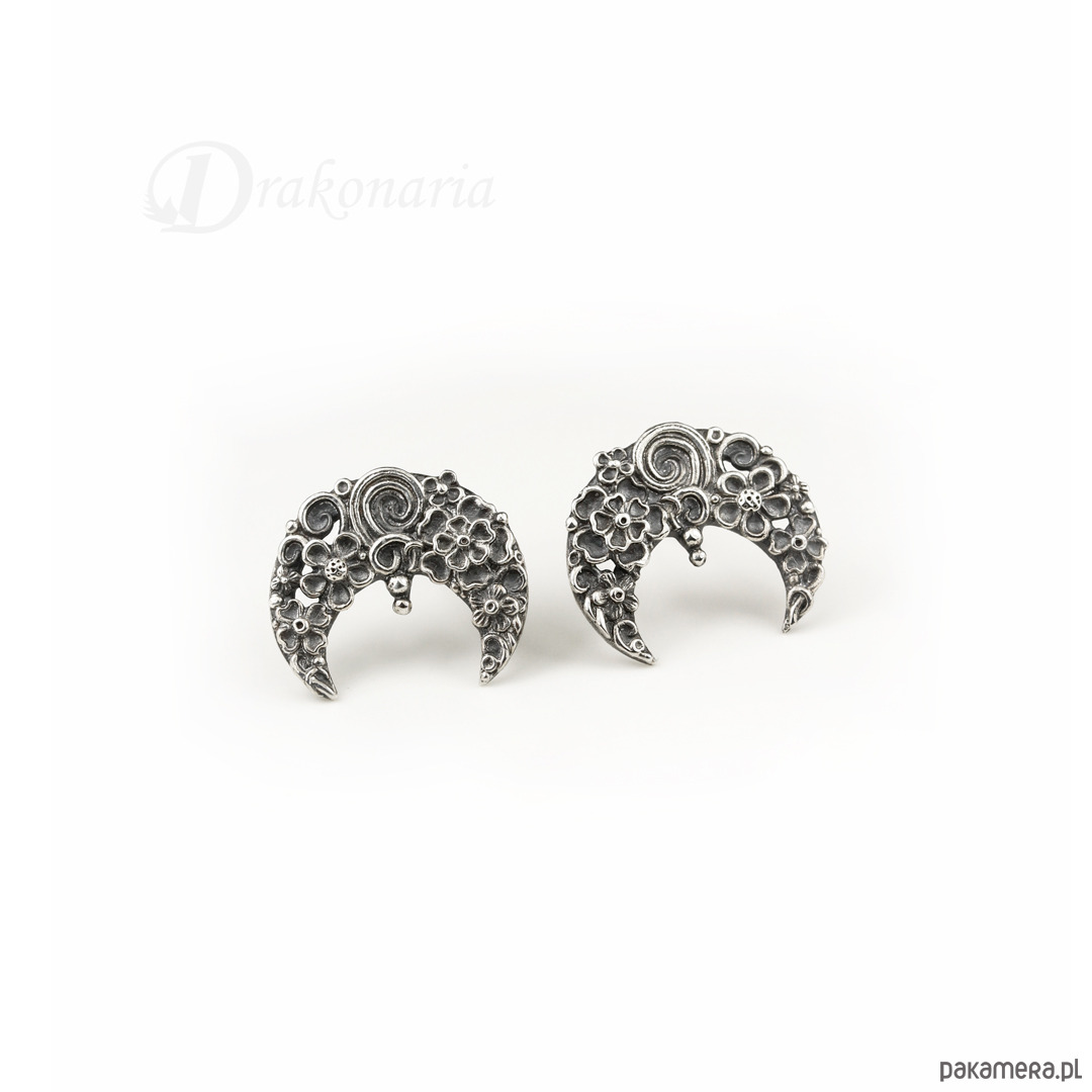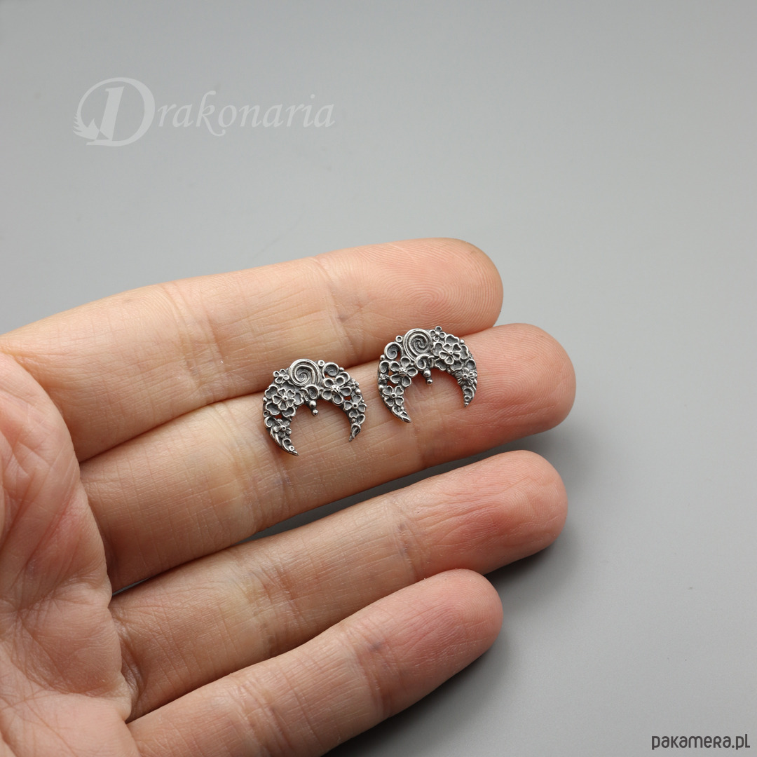 Maleńkie, ażurowe kolczyki typu sztyfty, wyrzeźbione w kształt słowiańskiej lunuli, pełne magicznych detali. Każdy szczegół - przeplatające się pnącza, miniaturowe kwiaty, kuleczki itd. - zostały zaprojektowane i wyrzeźbione przeze mnie ręcznie, a następnie wykonane w srebrze pr. 925. Całość oksydowana i polerowana dla podkreślenia przestrzenności płynnych ornamentów i subtelności całego wzoru. Idealne dla osoby lubiącej drobną, ale niezwykle misterną biżuterię.