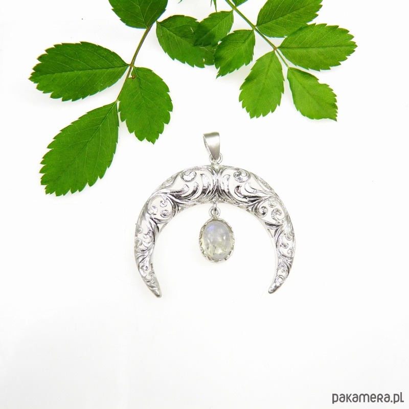 Niezwykła zawieszka wykonana ze srebra próby 925 w kształcie ażurowego półksiężyca symbolu Lunuli z zawieszonym kamieniem księżycowym w oprawie srebrnej.