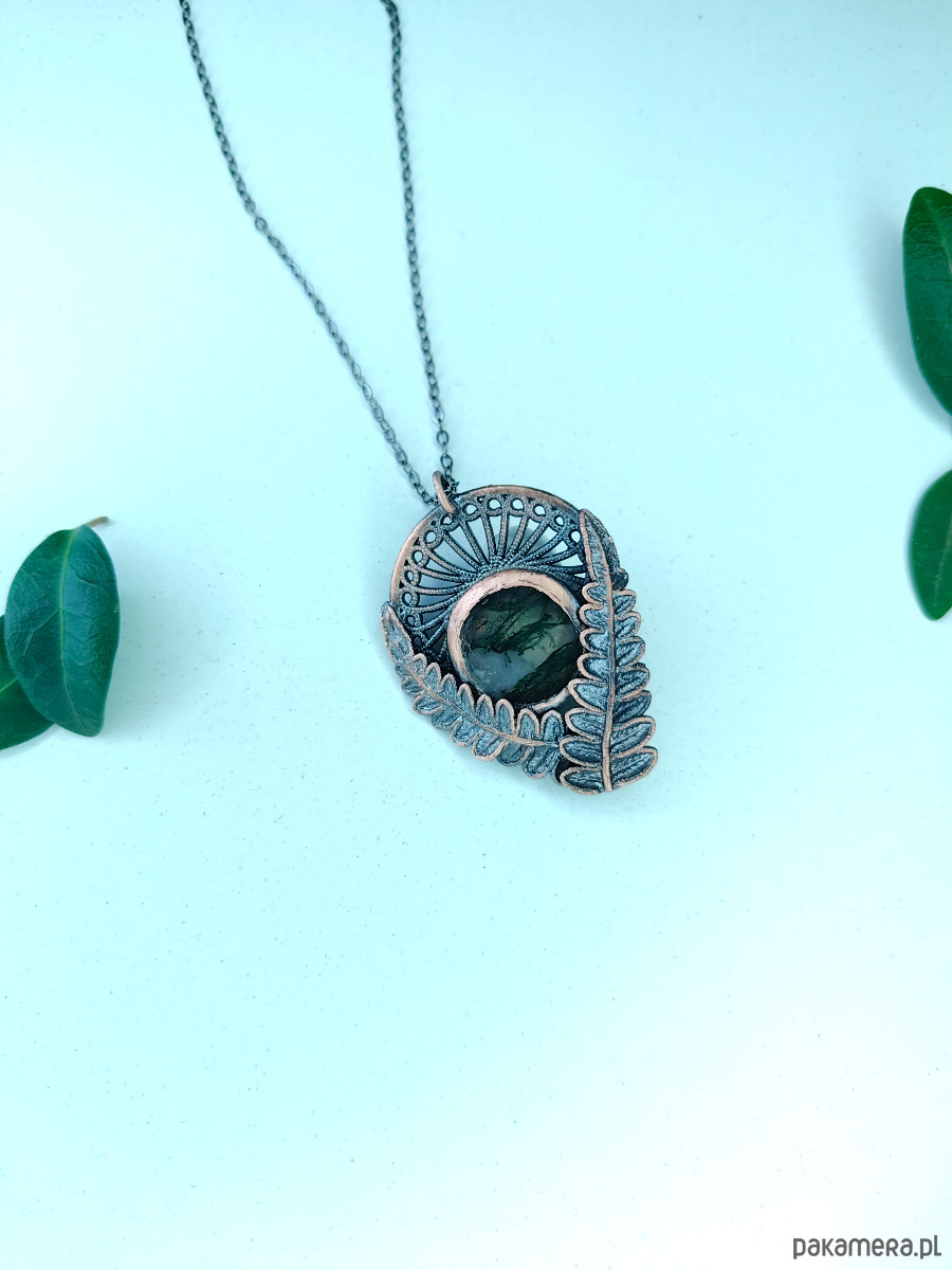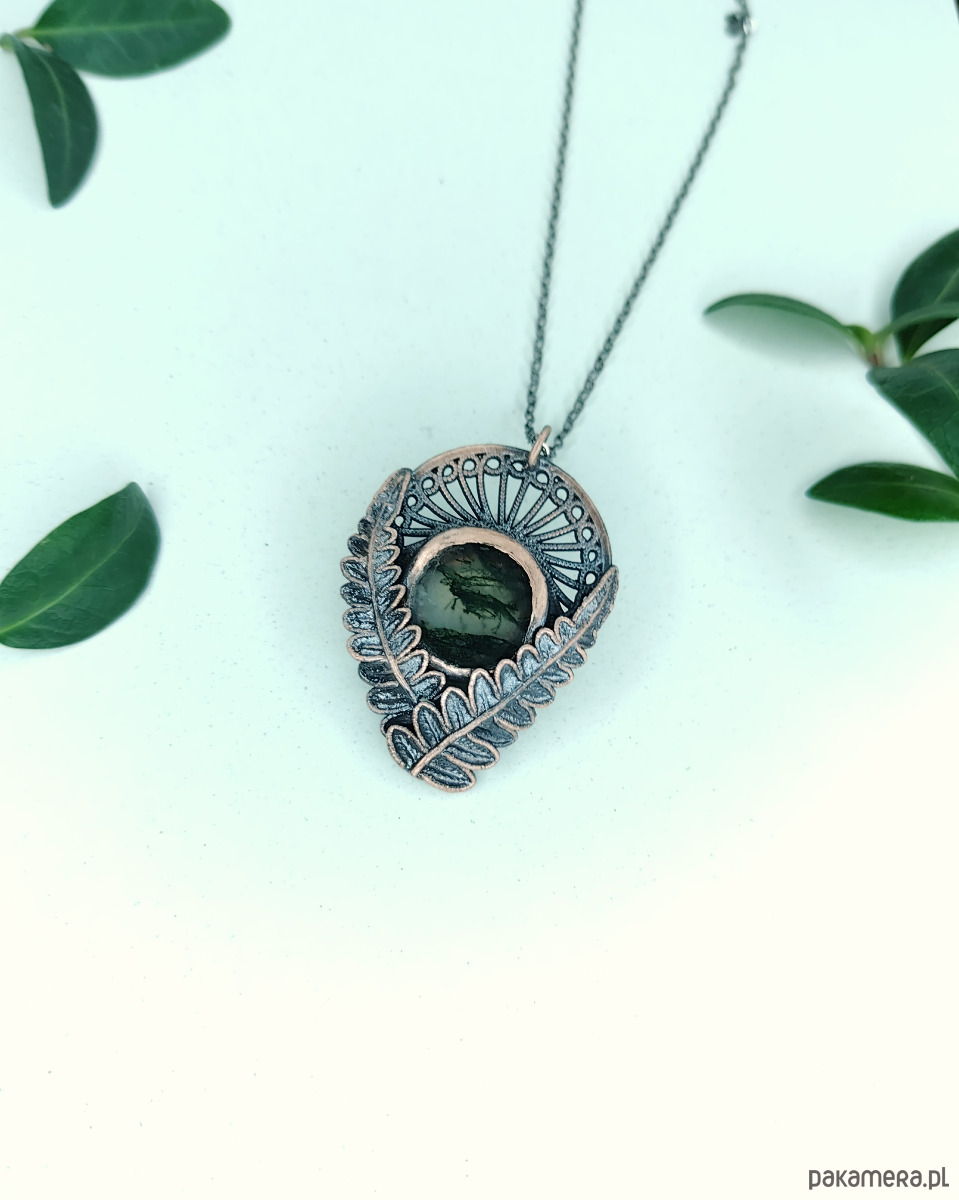 Miedziany Wisiorek Ażurowa Lunula z Listkami Paproci i Agatem Mszystym- talizman ochrony, intuicji i harmonii z naturą