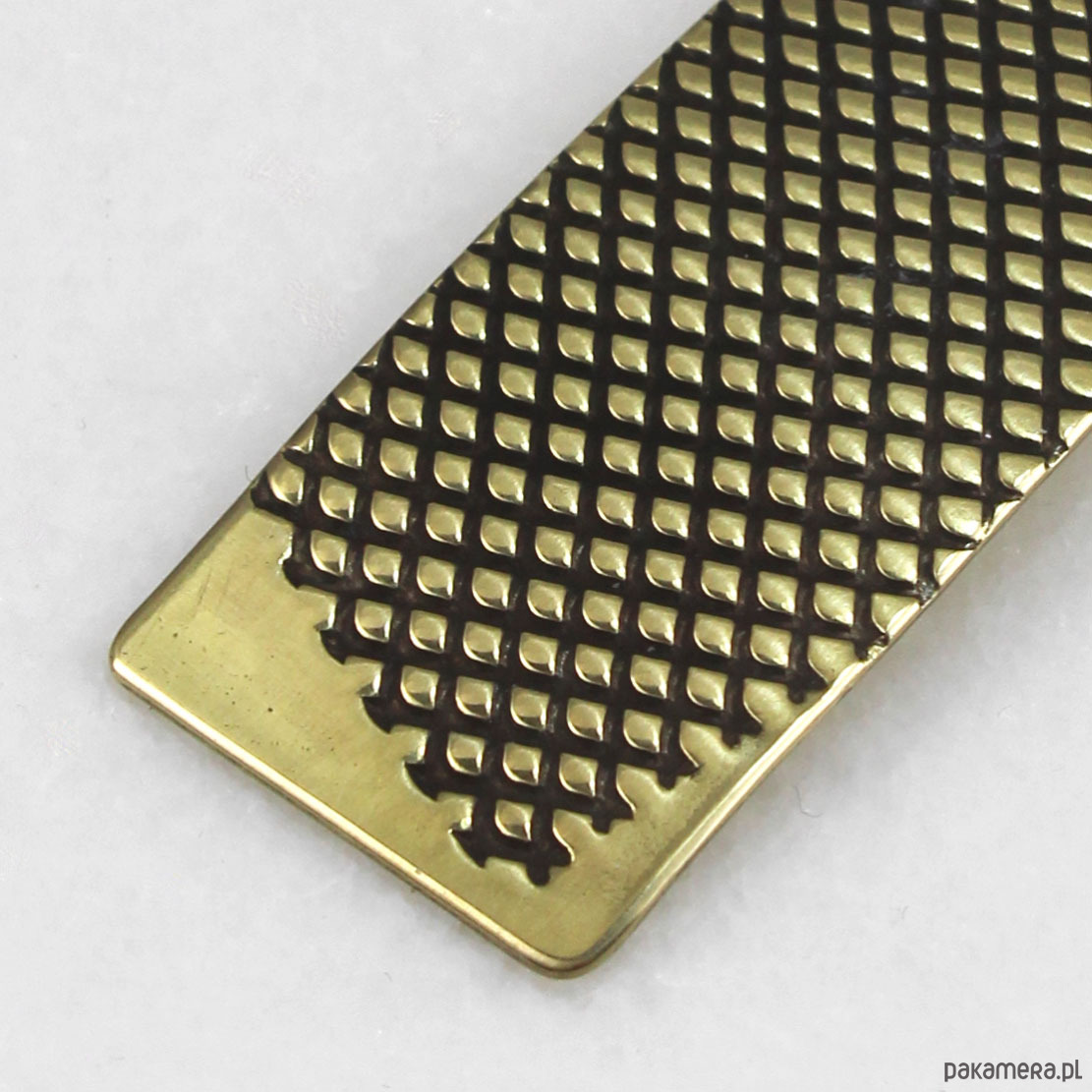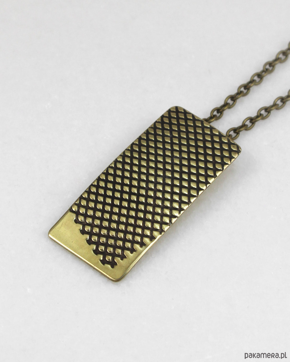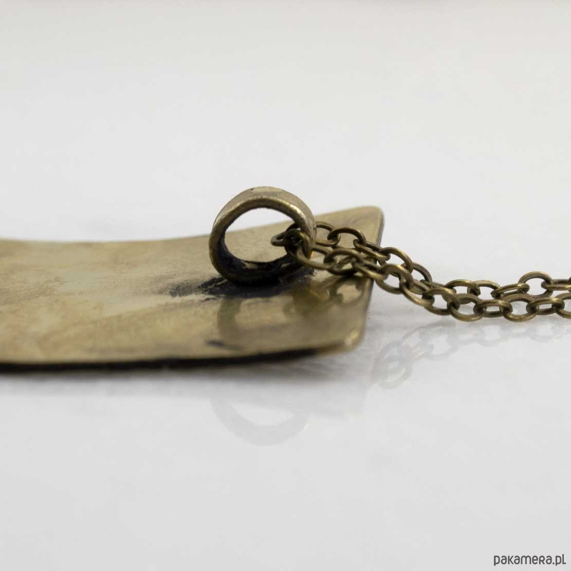 Wisior został wykonany ręcznie z mosiądzu, ma nieregularną fakturę i jest lekko patynowany w procesie oksydacji (bez użycia sztucznych barwników). Całkowita długość wisiorka to ok 4,5 cm. W komplecie łańcuszek do zawieszenia.