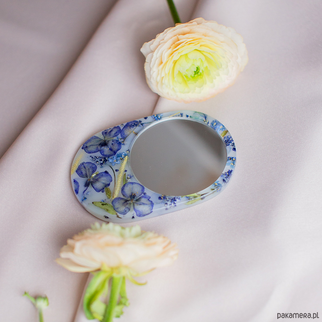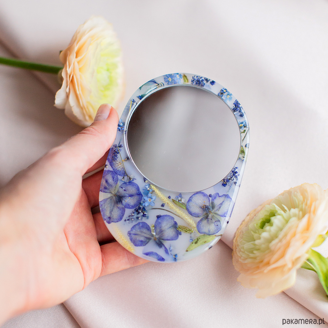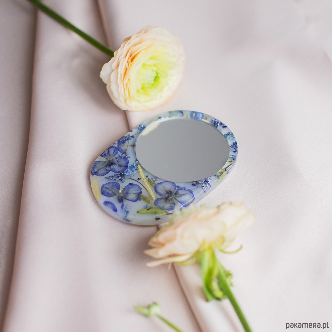 Lusterko wykonane jest z prawdziwych suszonych kwiatów i żywicy epoksydowej.