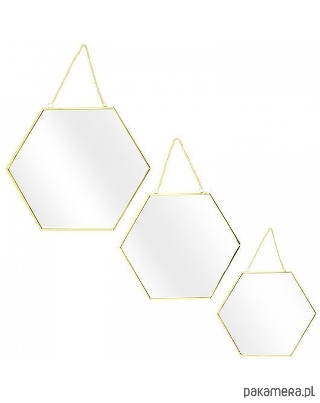 Zestaw 3 lusterek Hexi został wykonany z metalu. Można je zawiesić na metalowych złotych łańcuchach.