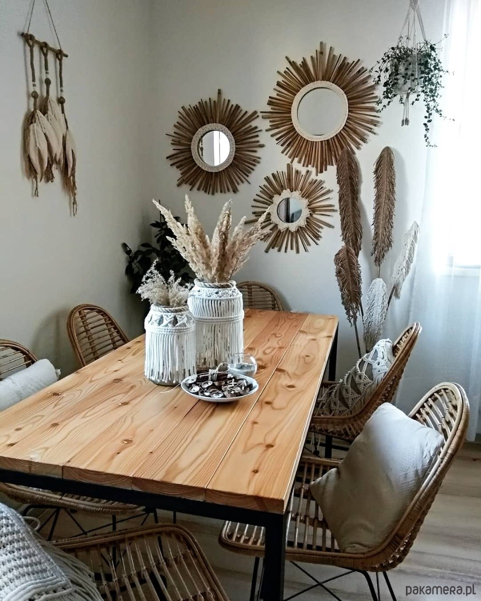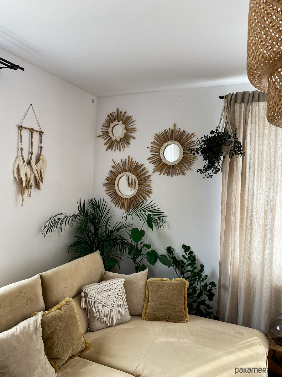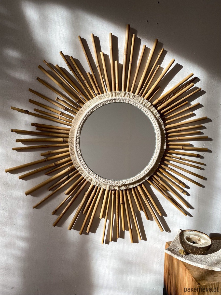 Lustro boho wykonane z naturalnych kijków bambusa z dekoracyjnym makramowym splotem.