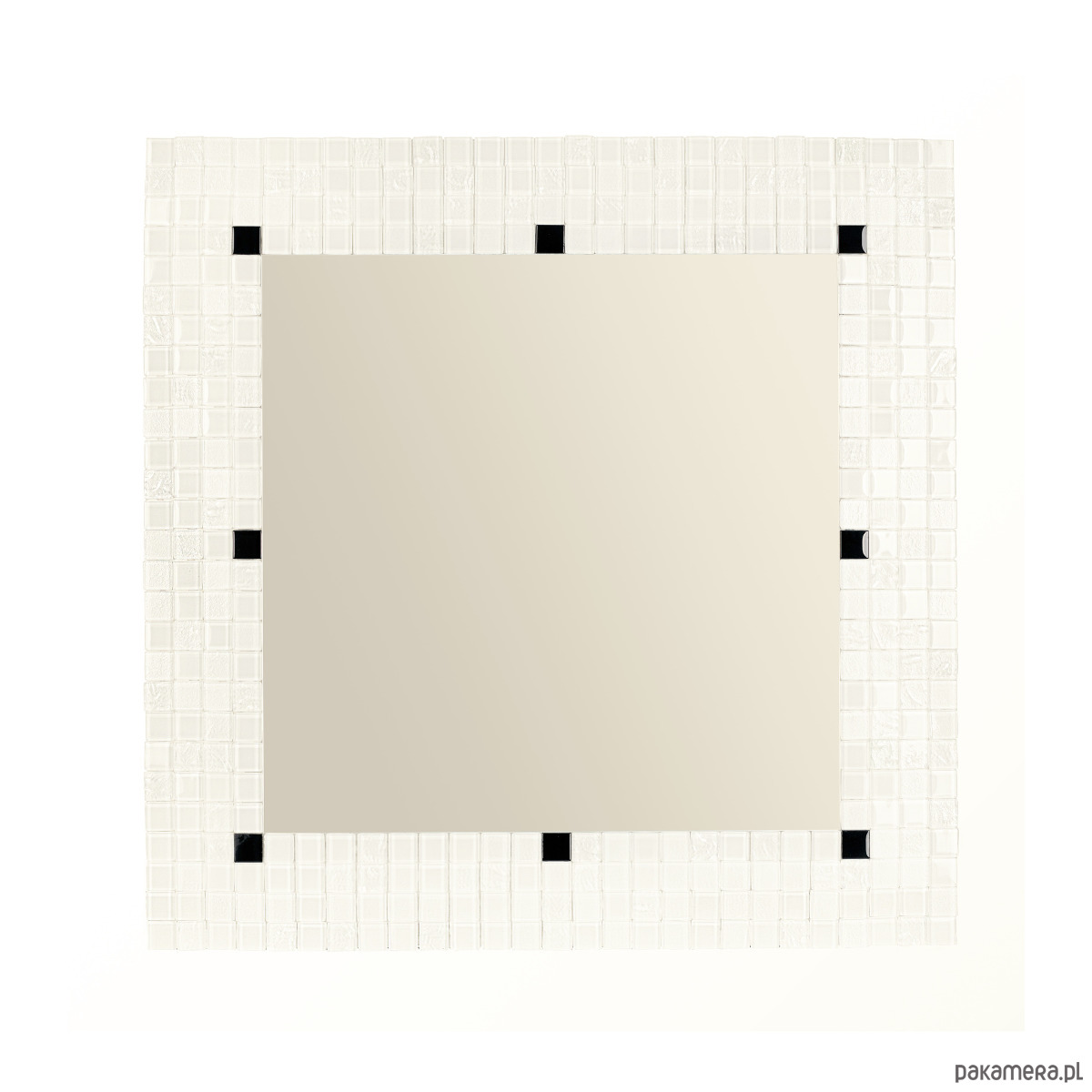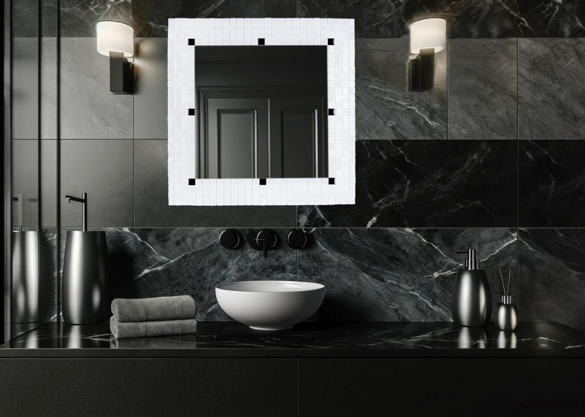 Dekoracyjne kwadratowe lustro Montesol otoczone biała szkliwioną mozaiką z kontrastowymi kostkami w kolorze czarnym.
