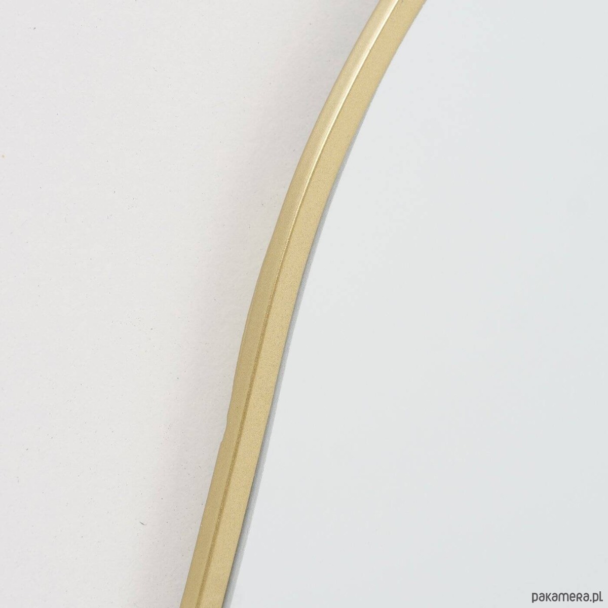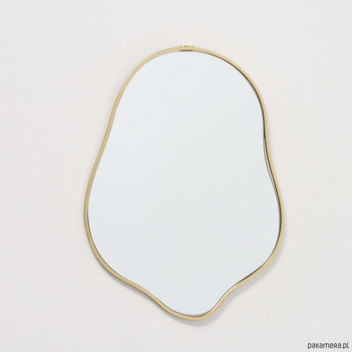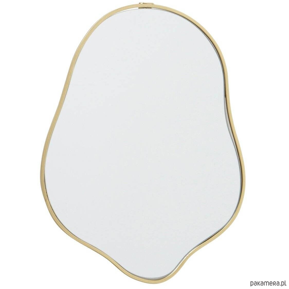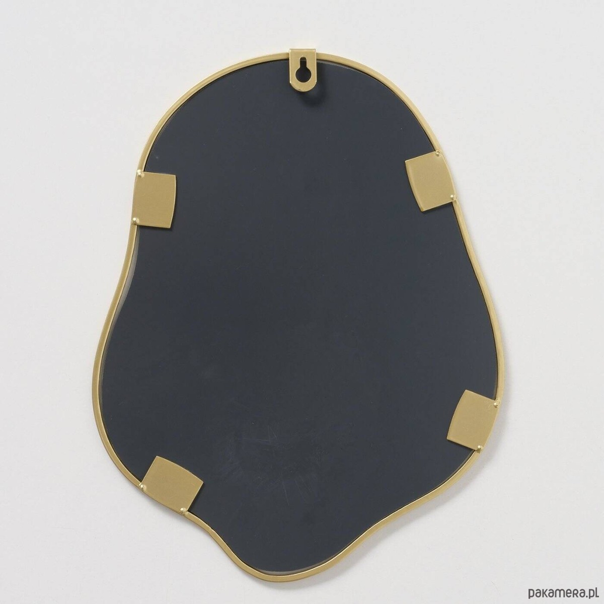 Lustro dekoracyjne w złotej, metalowej ramie ma nieregularny kształt. Może być traktowane jako rodzaj ciekawej dekoracji pomieszczenia.