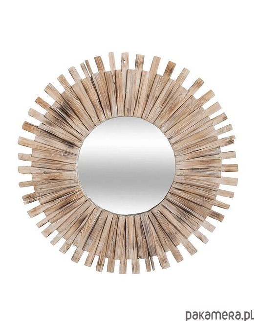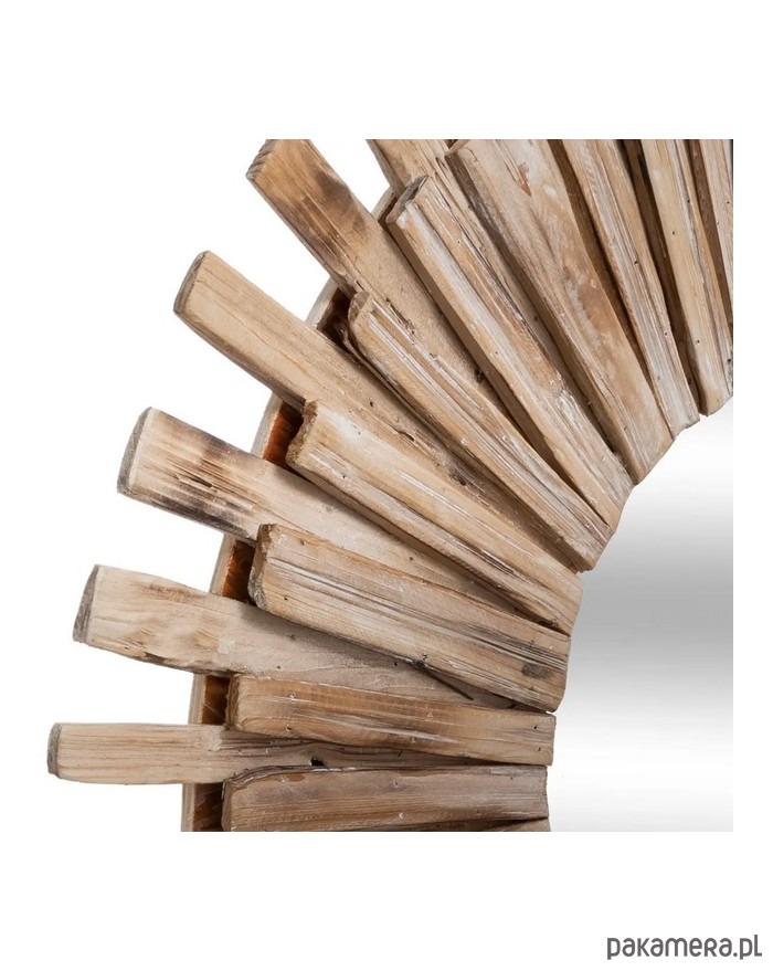 Okrągłe lustro w drewnianej ramie. Składa się z połączonych ze sobą kawałków drewna pochodzącego z recyklingu (jodła). W kolorze naturalnym. Lekko bielone. Pasuje do każdego wnętrza. Przepiękne!