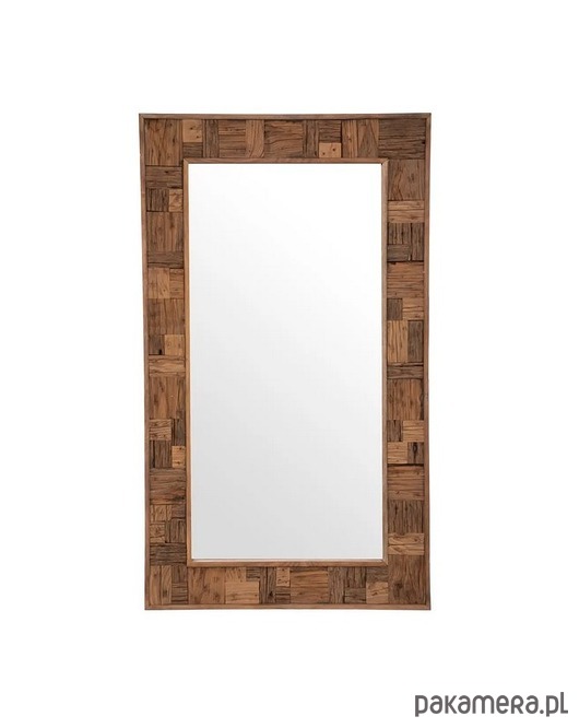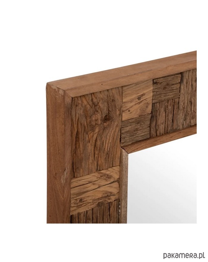 Lustro w stylu eko. Prostokątne, duże, w ramie z połączonych kawałków drewna z recyklingu. Można je postawić, powiesić w pionie lub poziomie. Ze względu na ręczne wykonanie na każdym produkcie widoczne są niepowtarzalne ślady i nierówności. Wkręty do mocowania do ściany nie wchodzą w skład zestawu.