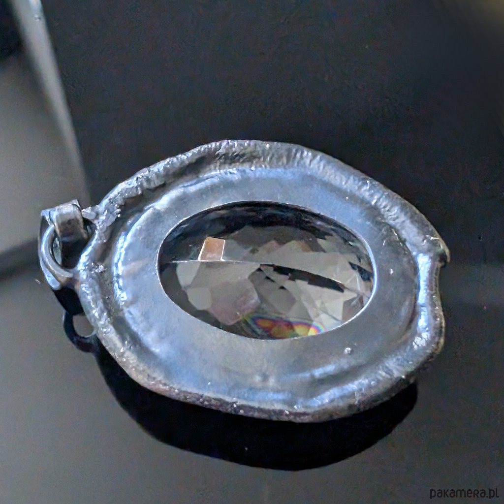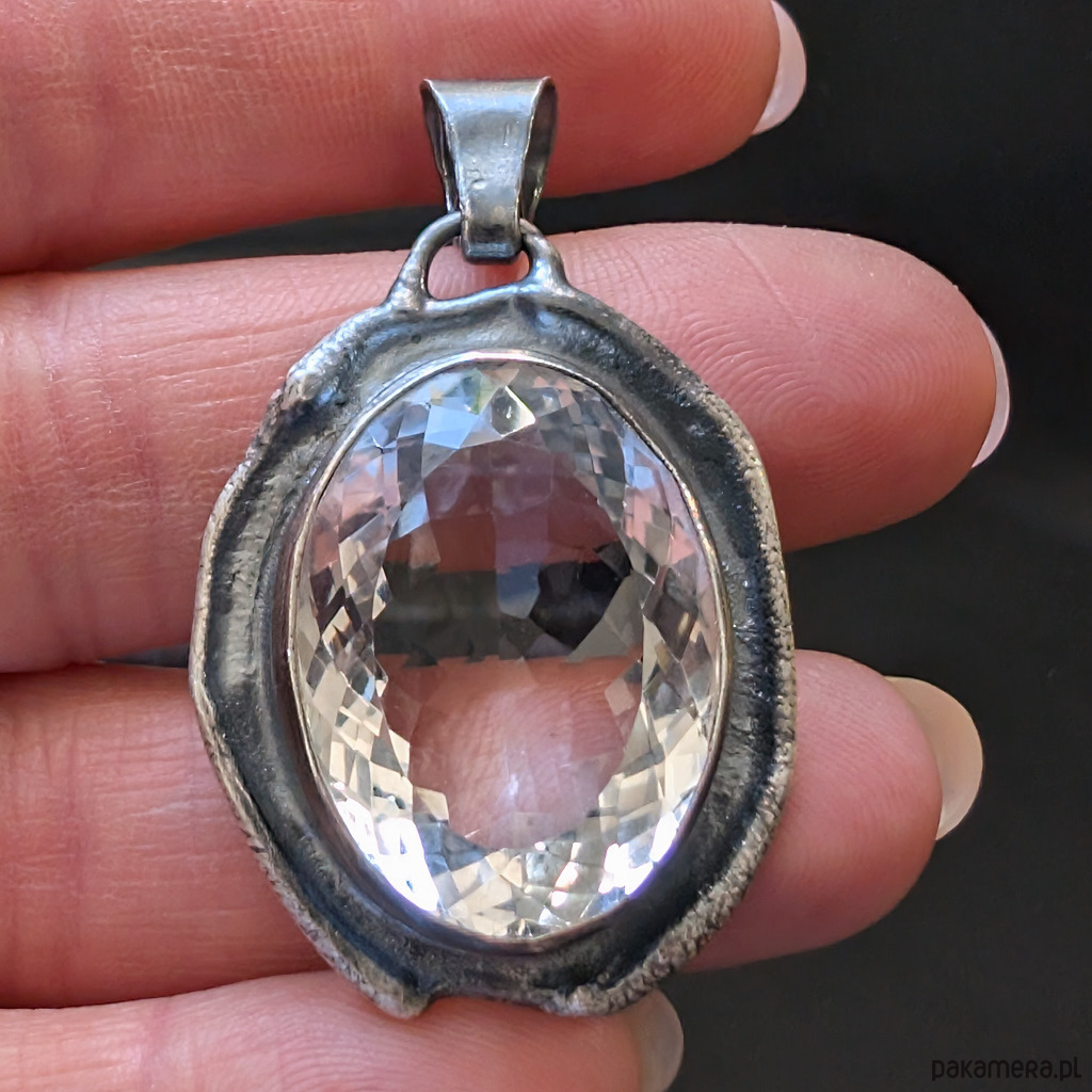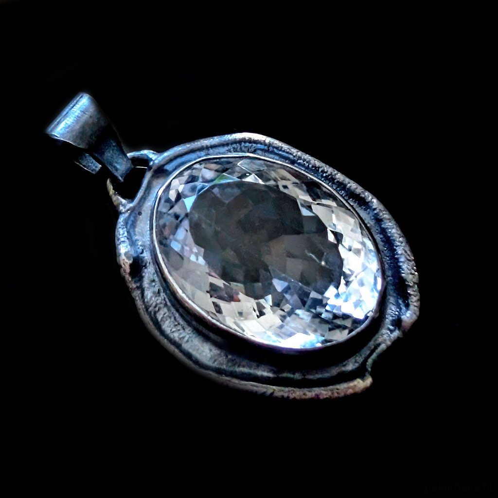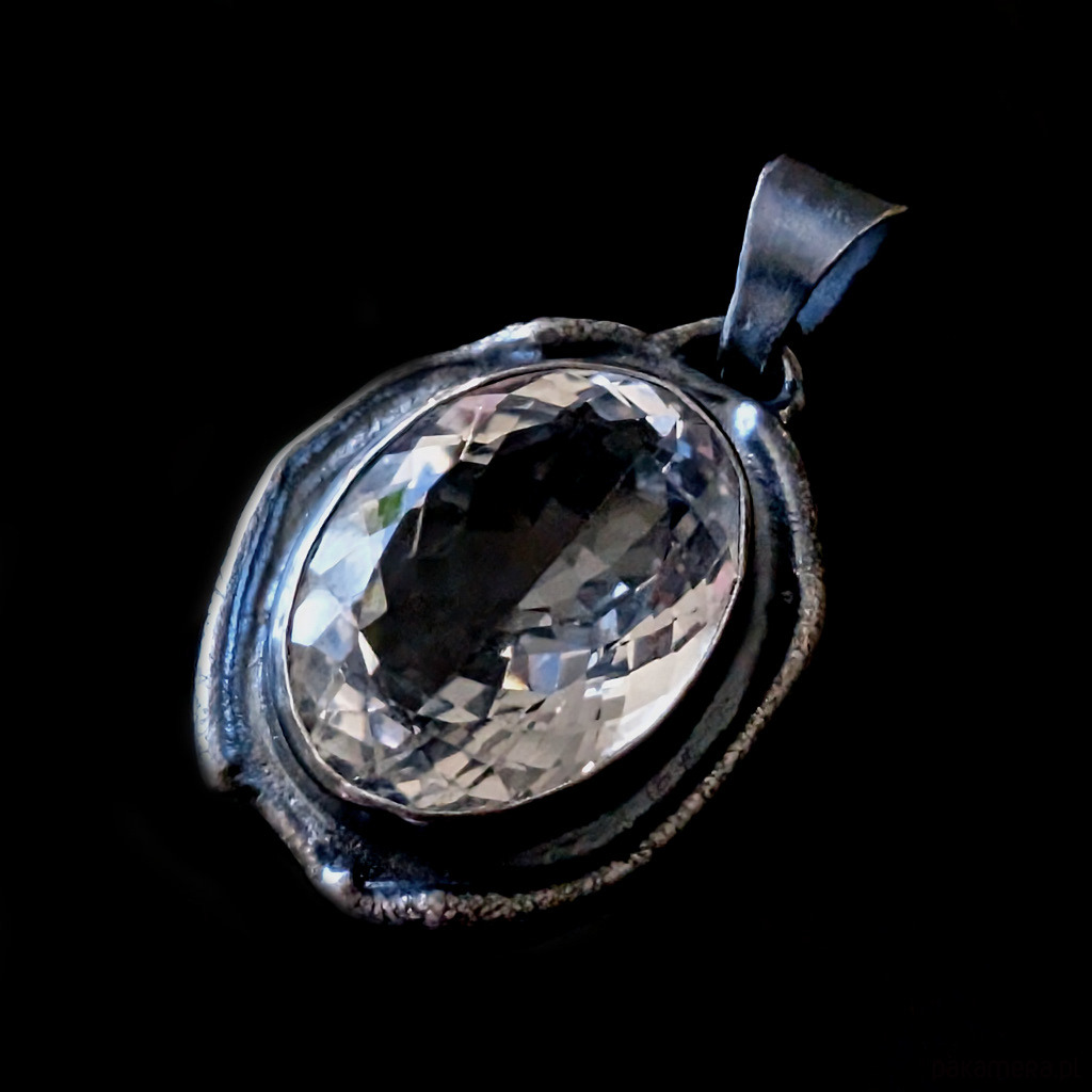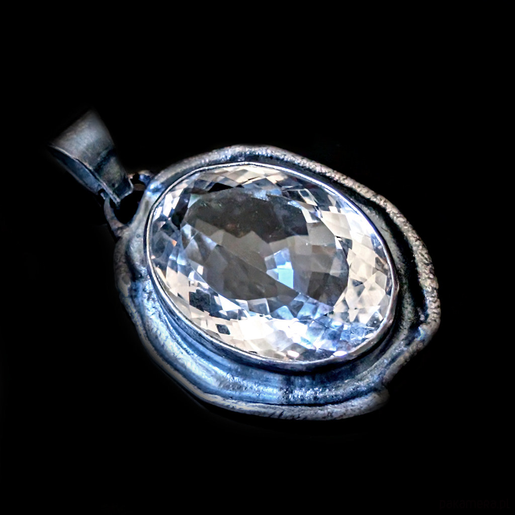 Wisiorek z naturalnym kryształem kwarcu zwanym górskim o nieskazitelnej czystości i precyzyjnym, misternym szlifie. Niezwykłe, ultraczyste lustro minerału. Kryształ oprawiony w srebro pr.925. Wymiary całego wisiora 34 x 27 mm. Długość z krawatką 45 mm. Waga 15,7 grama. Wisior zostanie wysłany w ozdobnym pudełeczku.