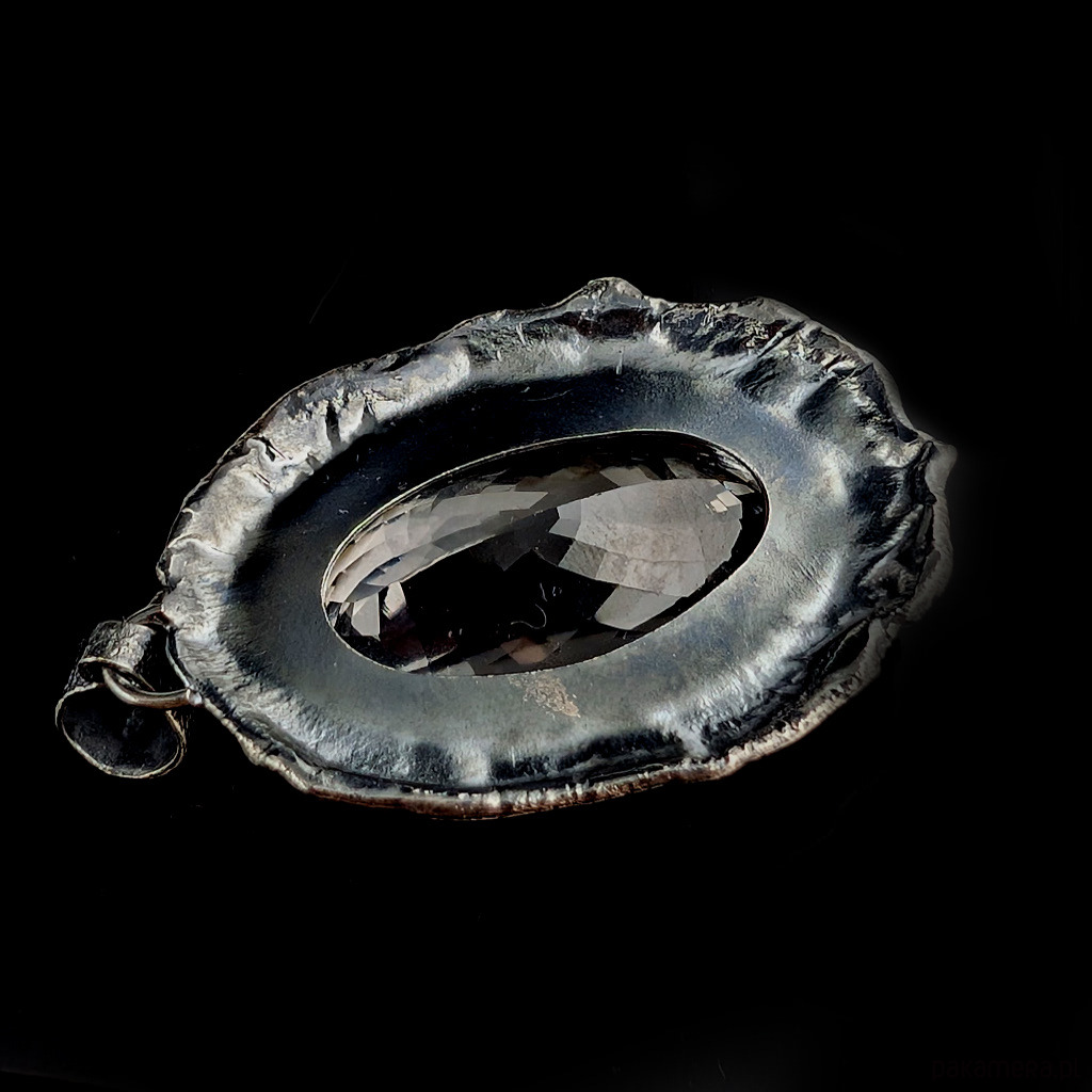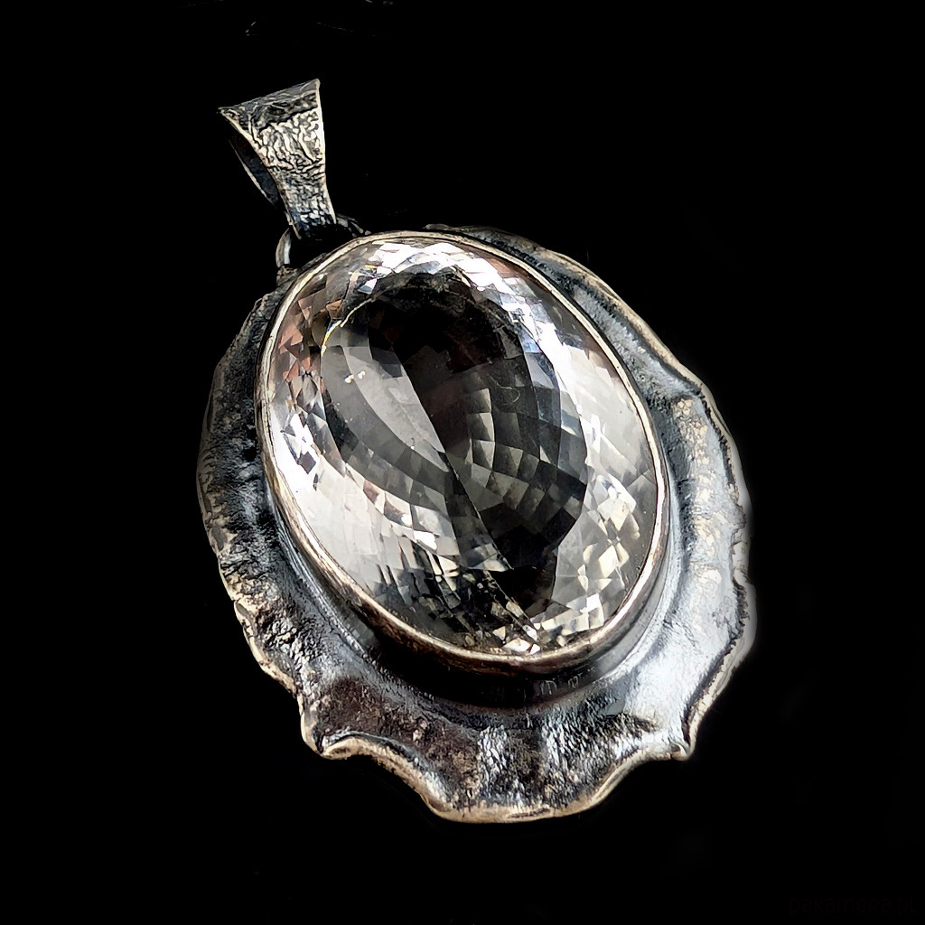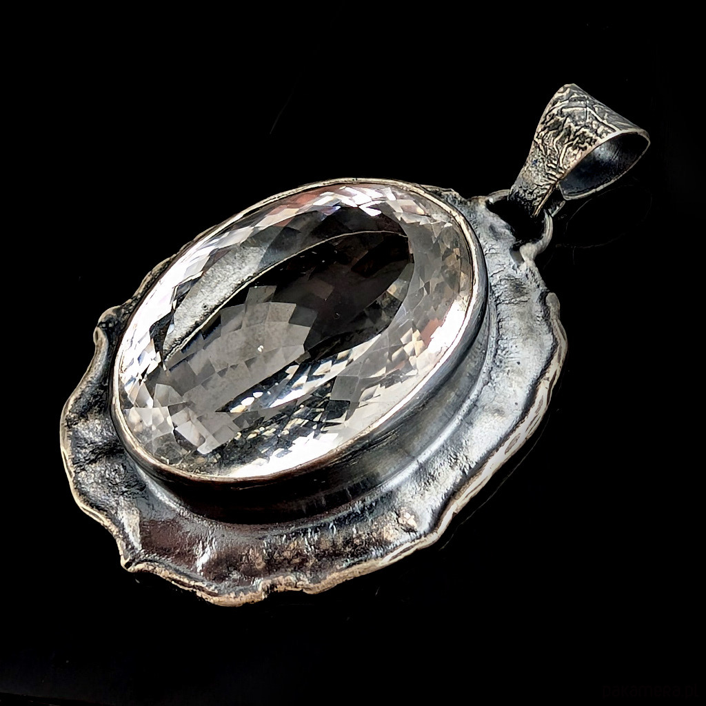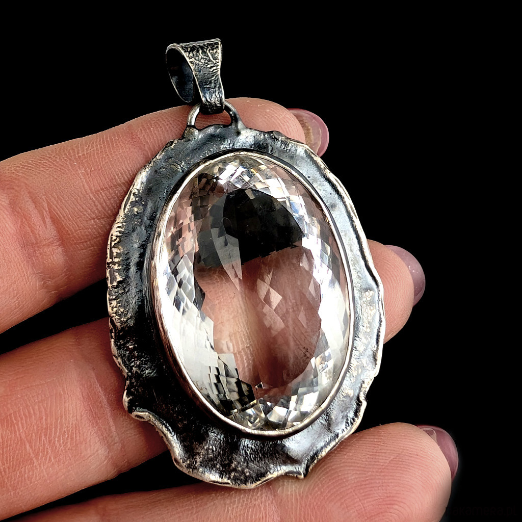 Bardzo okazały, masywny wisior z naturalnym kryształem kwarcu zwanym górskim o nieskazitelnej czystości i precyzyjnym, misternym szlifie. Niezwykłe, ultraczyste lustro minerału. Kryształ oprawiony w srebro pr.925. Wymiary całego wisiora 46 x 36 mm. Długość z krawatką 57 mm. Waga 27,3 grama. Wisior zostanie wysłany w ozdobnym pudełeczku.