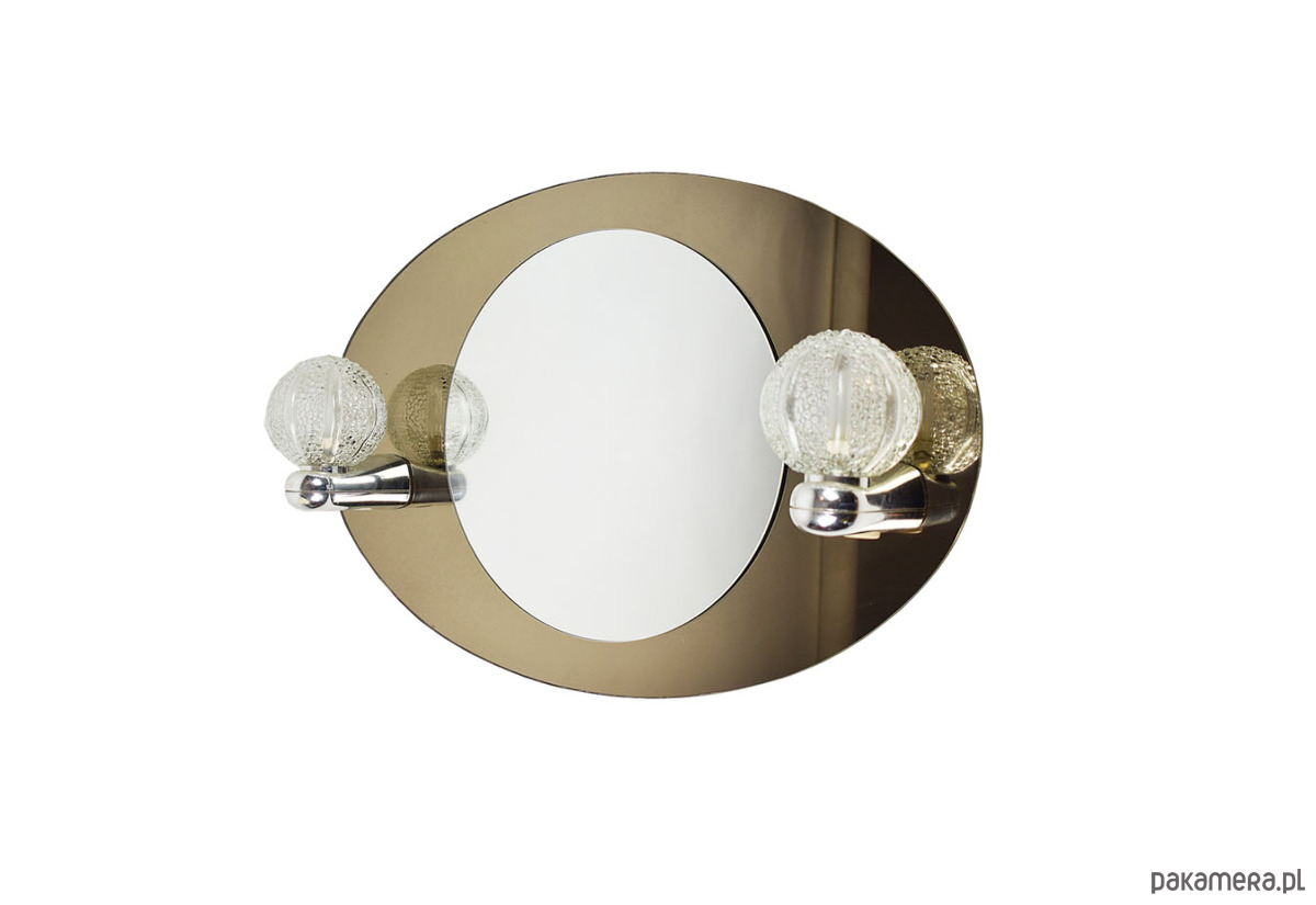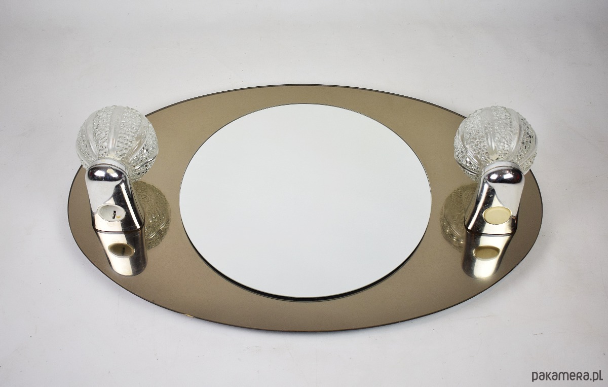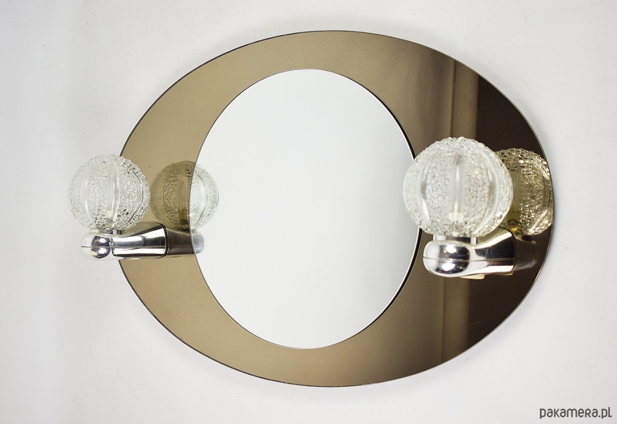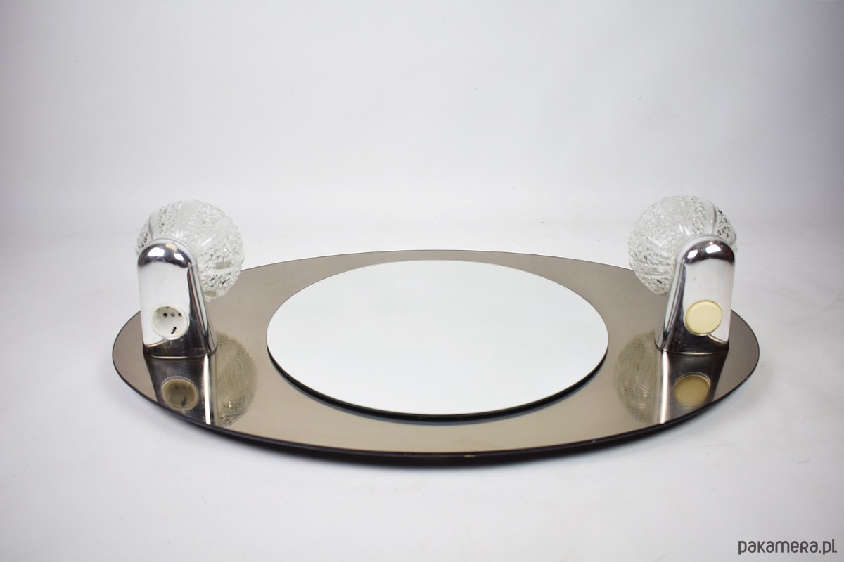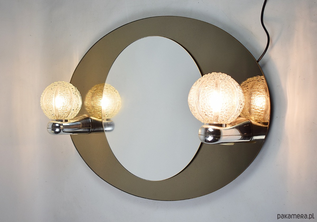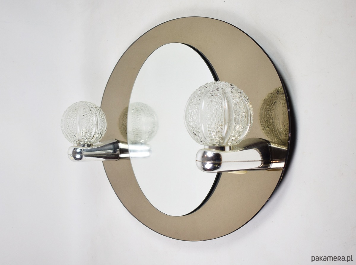 Okrągłe lustro łazienkowe w stylu vintage z oświetleniem, wyprodukowane w Niemczech w latach 70. Charakteryzuje się przydymionym (grafitowym) szkłem lustra i chromowanymi mocowaniami, w których osadzone są szklane klosze w kształcie kuli z efektem "bąbelkowego" (teksturowanego) szkła.