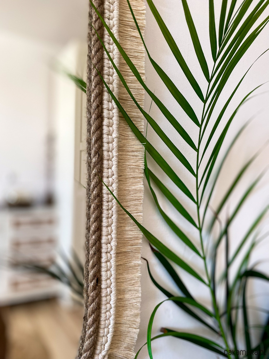 Lustro w ramie wykonanej techniką makramy ze sznurka bawełnianego o grubości 3 mm z elementem liny jutowej.
