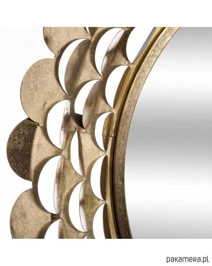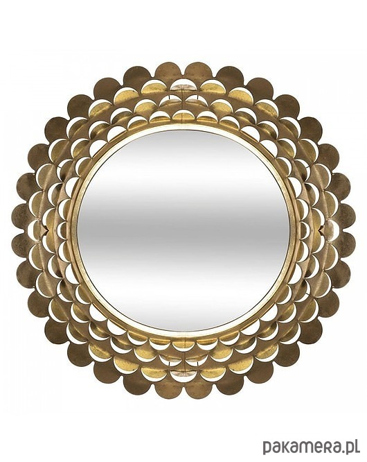 Okrągłe lustro wiszące, którego szeroka rama została wykonana z metalu. Bardzo dekoracyjna, w złotym kolorze. Będzie interesującą ozdobą ściany w salonie.