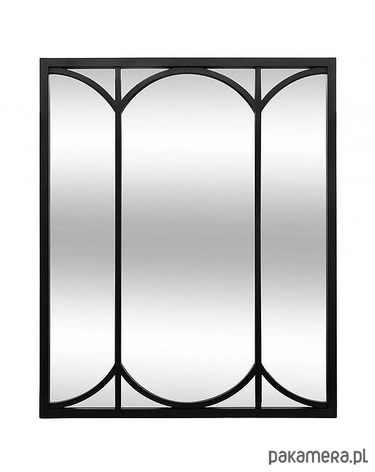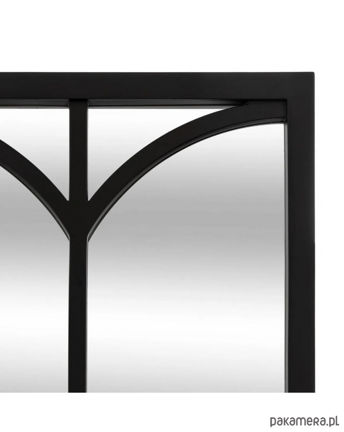 Lustro w formie ozdobnego okna. Rama i konstrukcja wykonane z MDF. W kolorze czarnym. Lustro w tylnej części posiada haczyki do powieszenia.