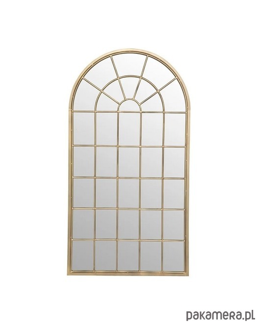 Duże lustro w kształcie okna w metalowej ramie. Posiada piękne, dekoracyjne szprosy. Rama jest w kolorze złotym. Celowo nieidealna.