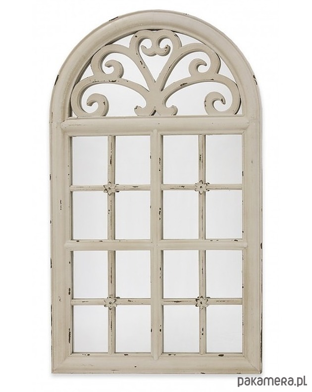 Lustro w kształcie okna ze szprosami. Wykonane z MDF. W kolorze kremowym. Lekko postarzane. Ozdobione delikatnymi, kwiatowymi wzorami.