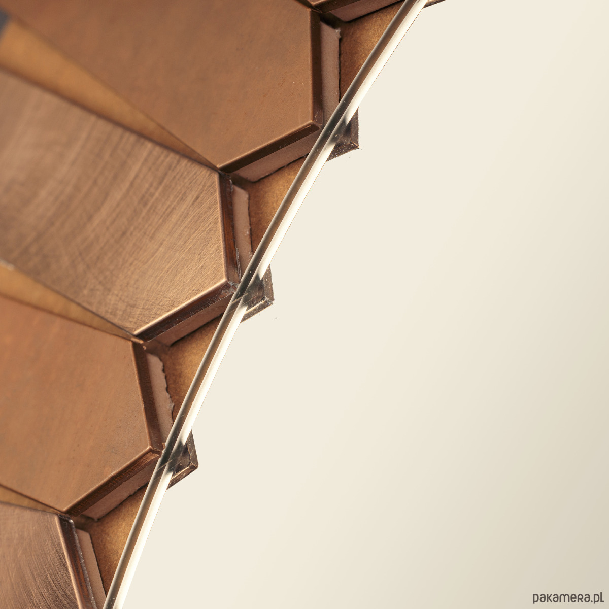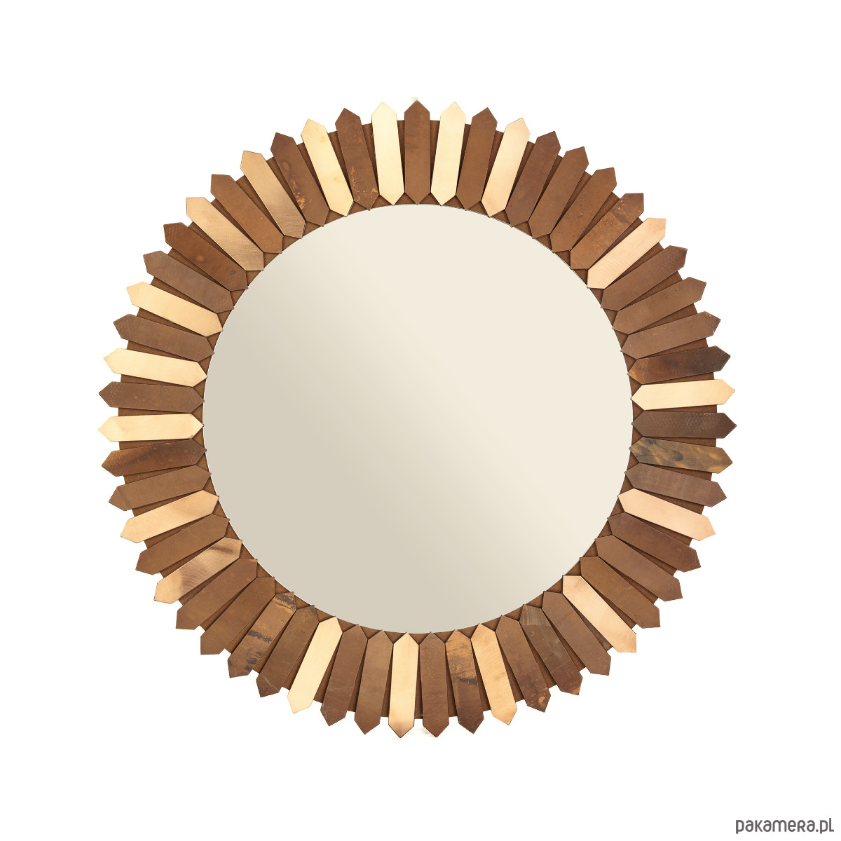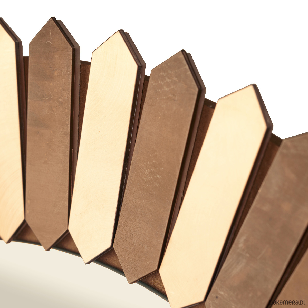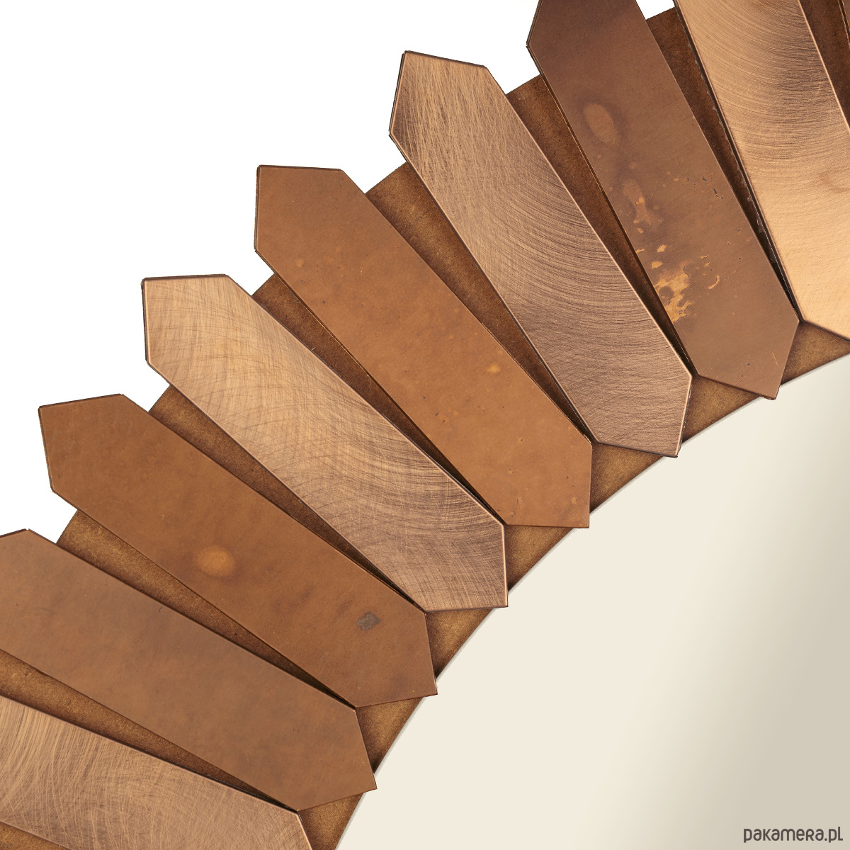 Dekoracyjne okrągłe lustro Gilma otoczone mozaiką ze stali nierdzewnej w kolorze miedzi. Ciekawe połączenie błyszczącej i matowej powierzchni w miedzianym kolorze doskonale będzie prezentować się na reprezentacyjnej ścianie.