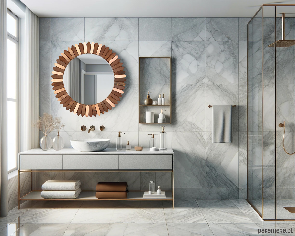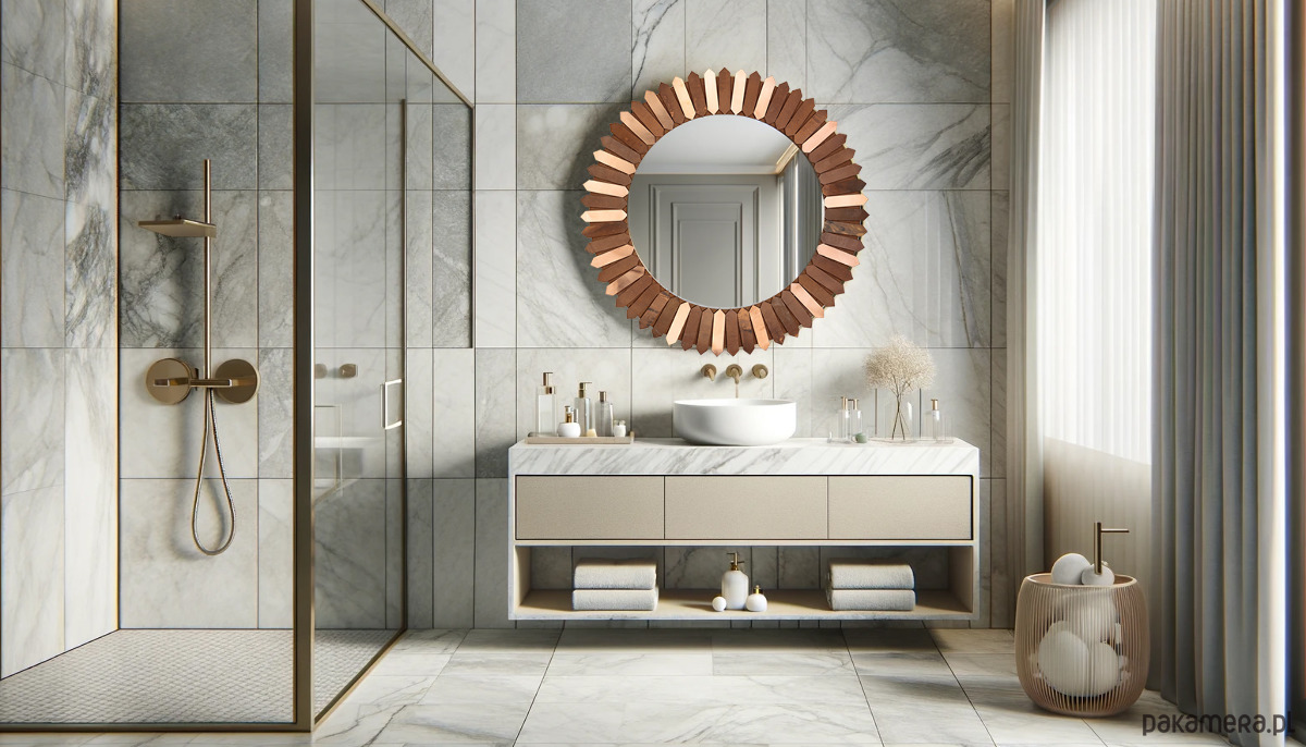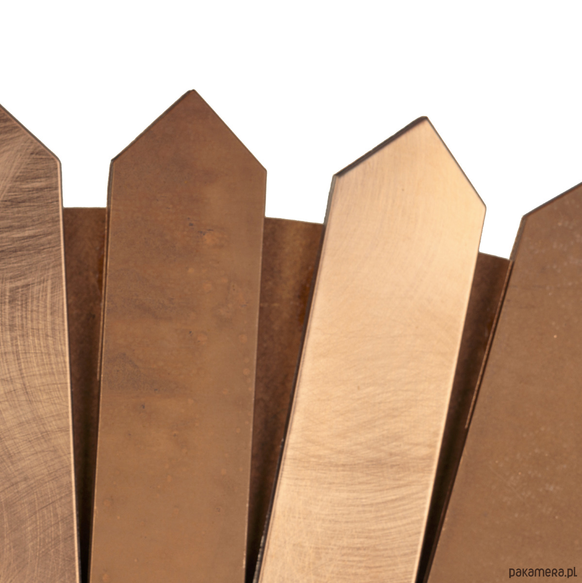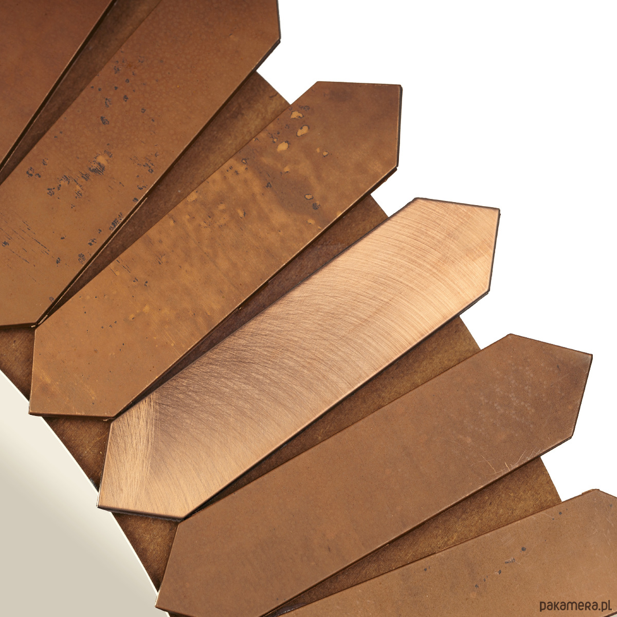 Dekoracyjne okrągłe lustro Gilma otoczone mozaiką ze stali nierdzewnej w kolorze miedzi. Ciekawe połączenie błyszczącej i matowej powierzchni w miedzianym kolorze doskonale będzie prezentować się na reprezentacyjnej ścianie.