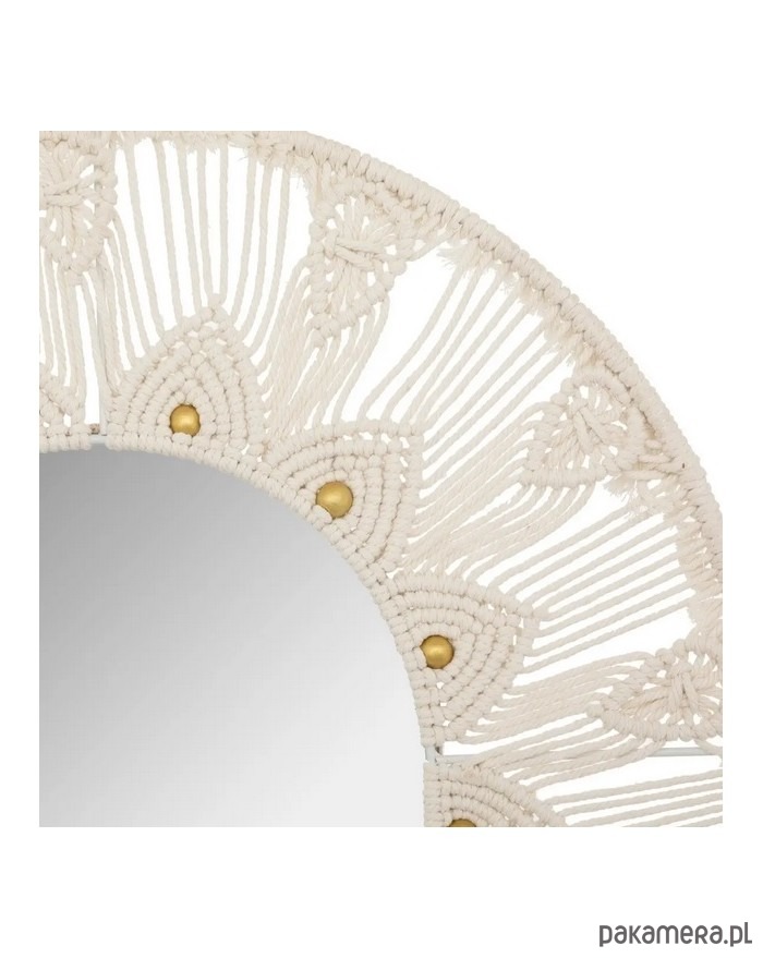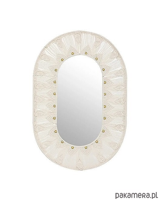 Bardzo ciekawe lustro o owalnym kształcie. Konstrukcja ramy jest metalowa. Opleciona została pięknym wzorem z bawełnianego sznurka. Posiada złote ozdoby.