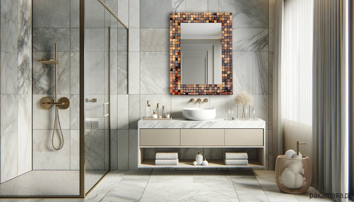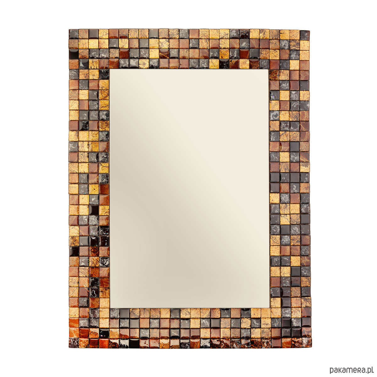 Lustro prostokątne do powieszenia na ścianę z mozaiki Sella w ciemnozłotej, brązowej oprawie. Efekt potłuczonego szkła