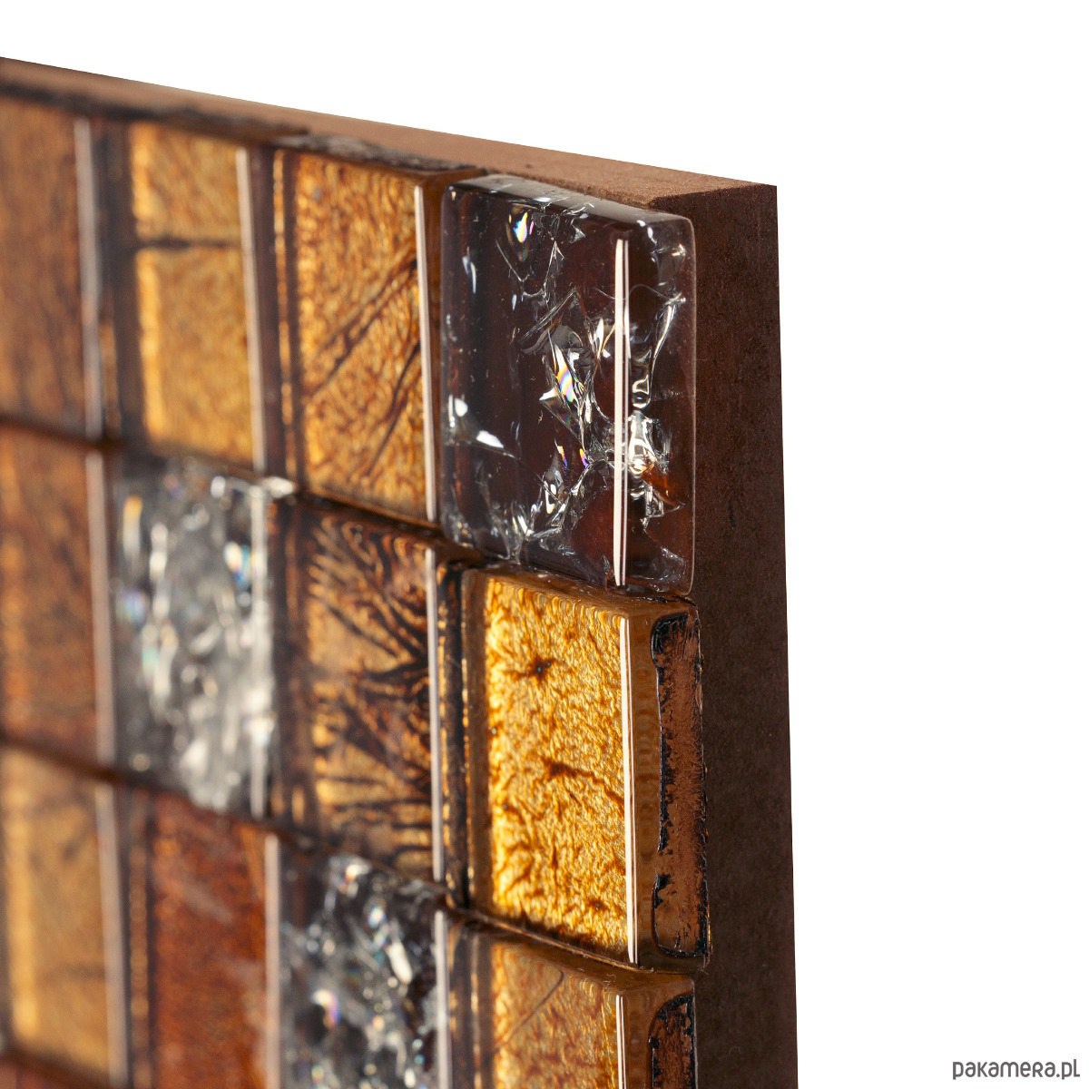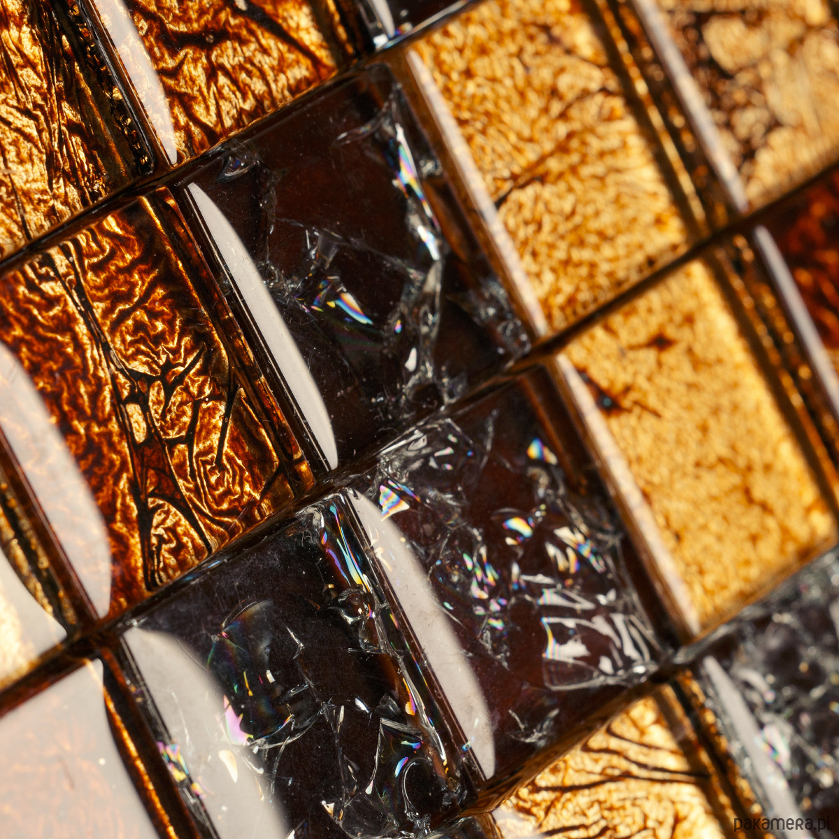 Dekoracyjne prostokątne lustro Sella otoczone kolorową mozaiką z zaznaczonym, wyraźnym wzorem. Wzór uzyskano dzięki wtopionej aluminiowej folii. Kolor brązowy, ciemnozłoty o różnej skali zabarwienia. W ramie lustra znajdziesz również akcenty czarne z efektem potłuczonego szkła. Doskonale sprawdzi się w ciepłych wnętrzach gdzie chcesz podkreślić przyjemny, intymny nastrój.