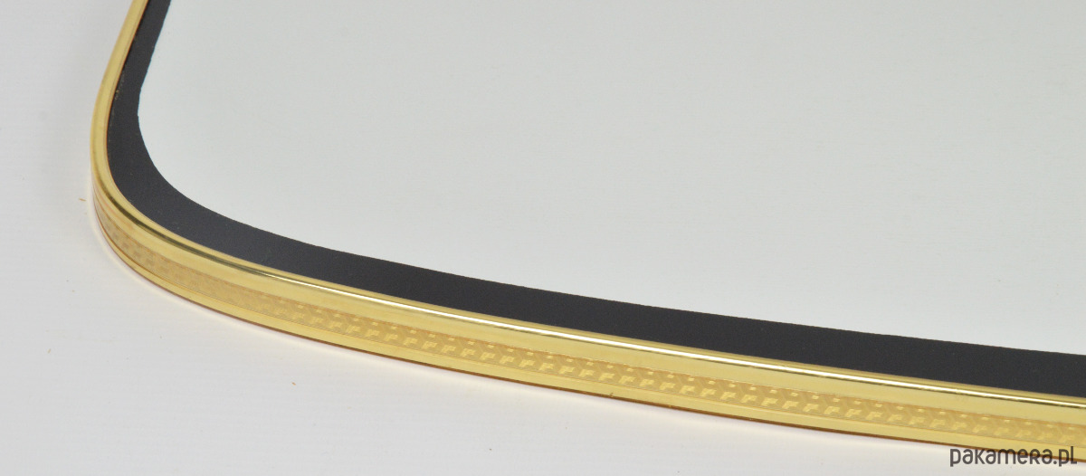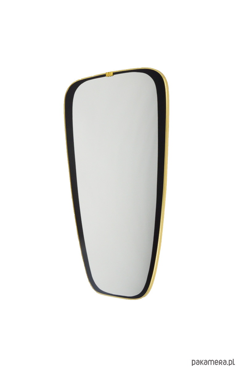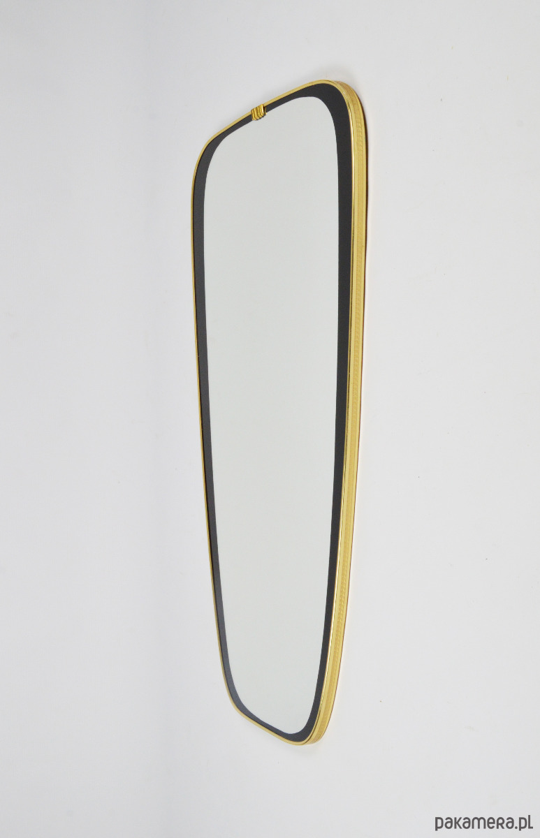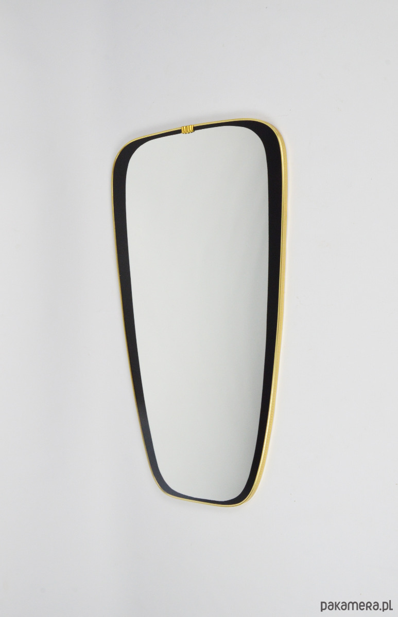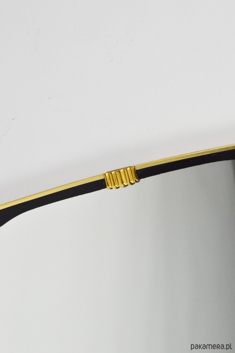 Lustro z lat 70 wykonane w stylu Rockabilly z charakterystyczną czarną taflą okalającą taflę lustrzaną. Osadzone w złotej ramie z dekoracyjnym motywem na szczycie lustra. Stan zachowania dobry, widoczne otarcia i drobne wgniecenia na złotej ramie oraz jedną większą rysę na tafli lustra.