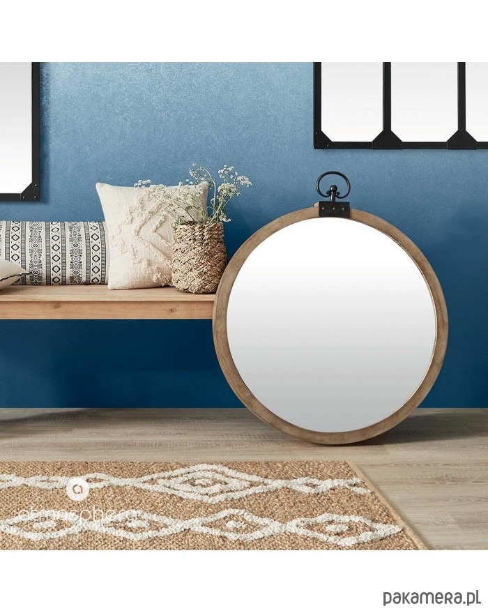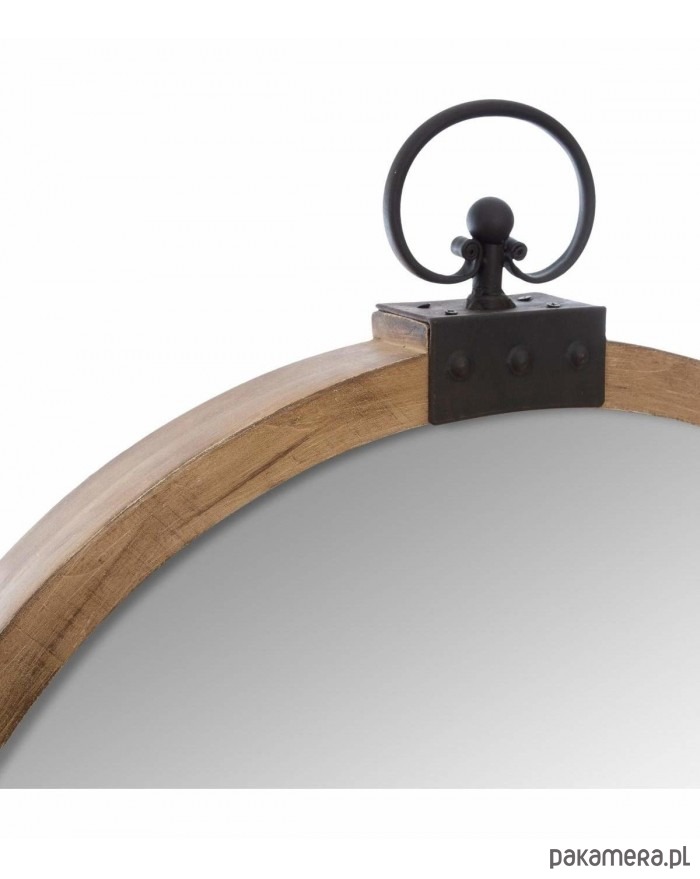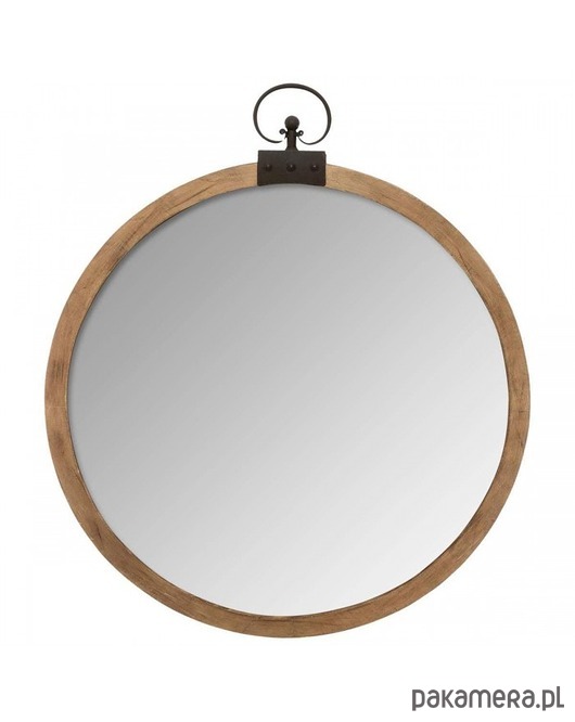Lustro wiszące w drewnianej ramie. Okrągłe. W kolorze naturalnym. Lekko postarzane. W górnej części posiada metalowy uchwyt.