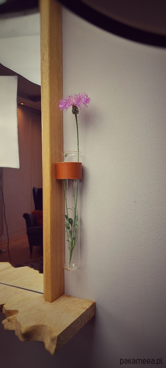 Szyku dodaje, delikatny wazonik w kształcie fiolki mocowany do ramy w uchwycie z naturalnej skóry.
