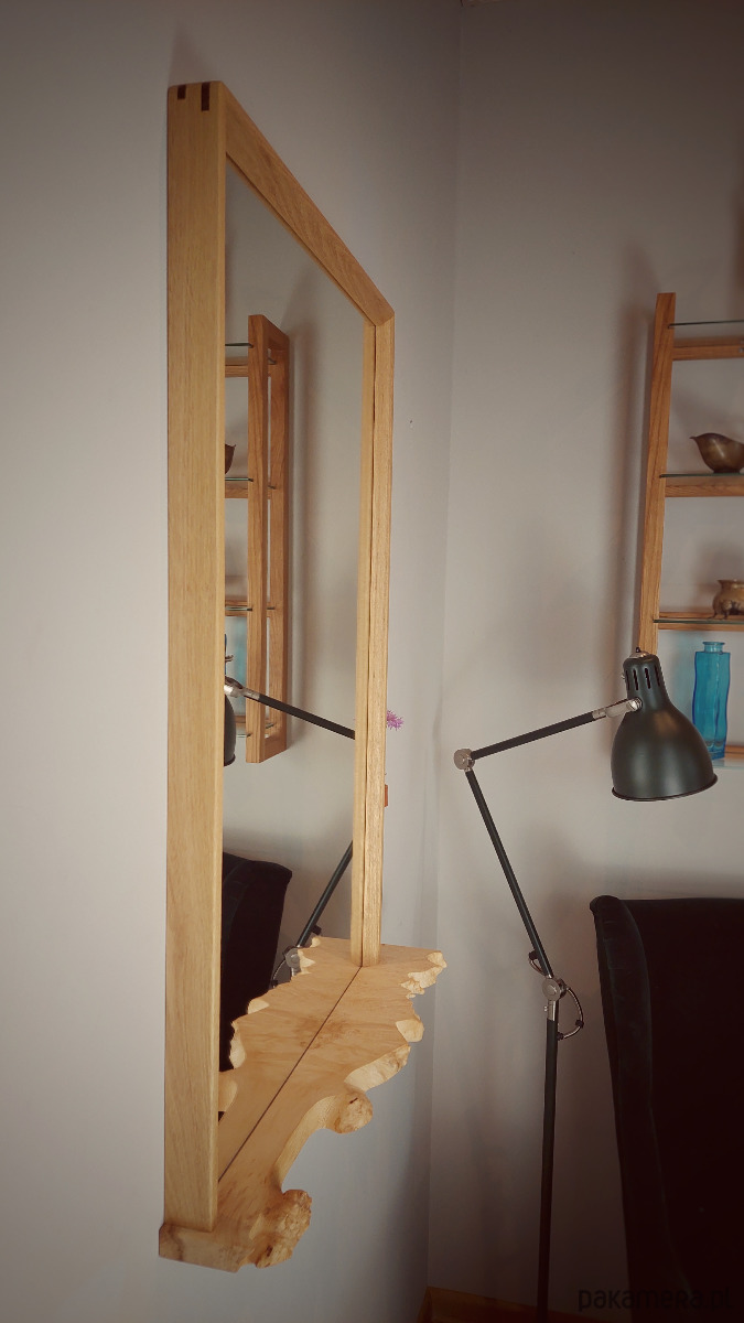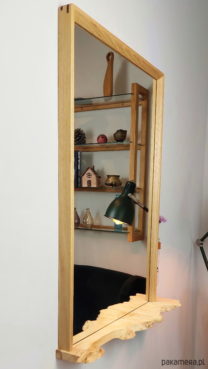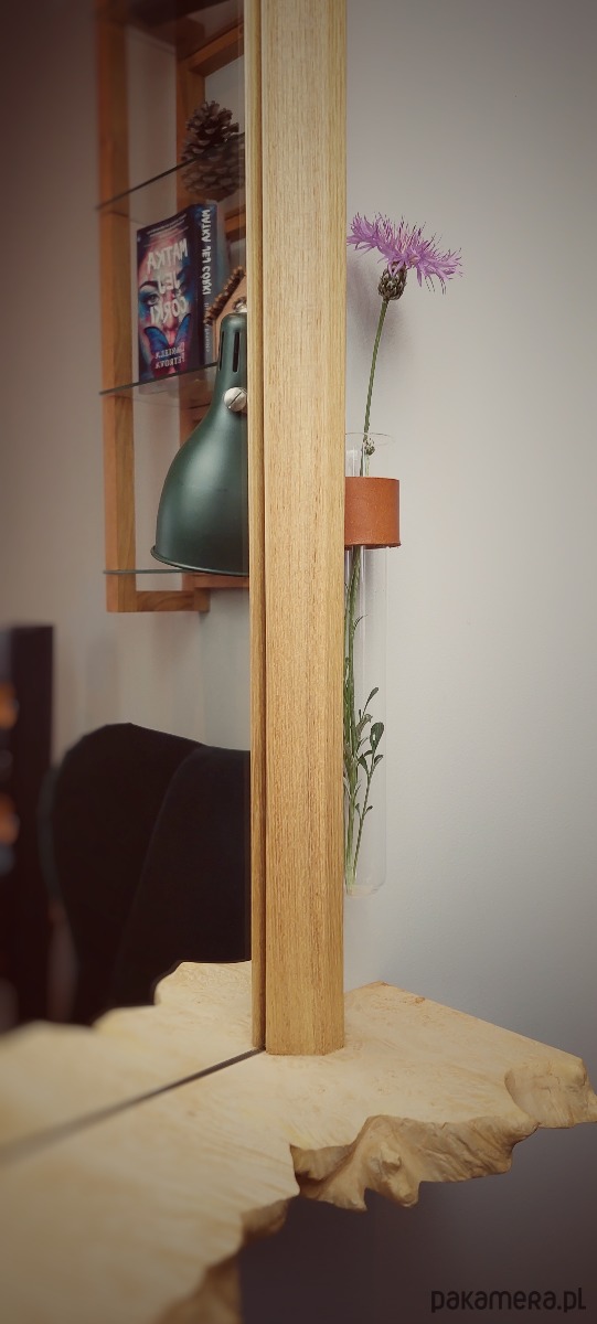 Lustro ścienne z półką live edge akacja + fiolka na kiatek