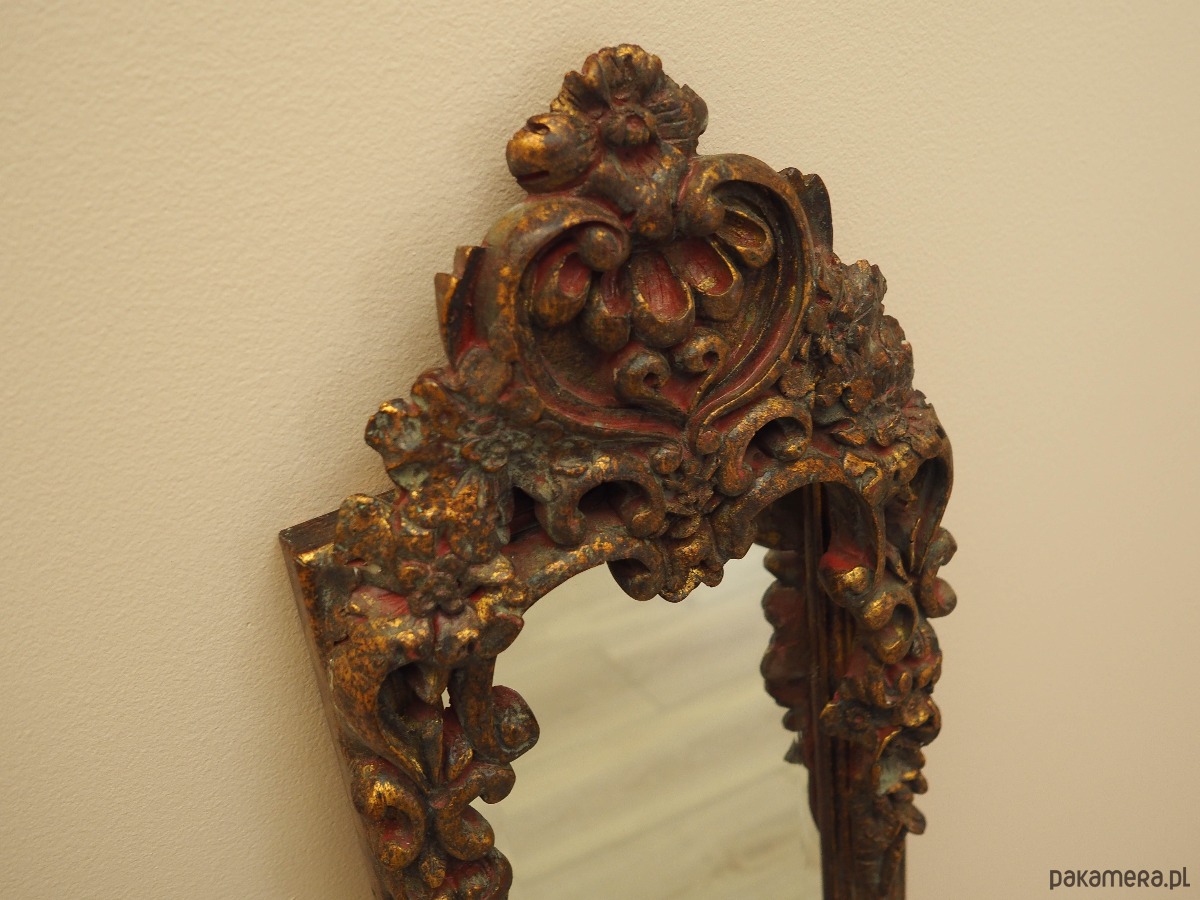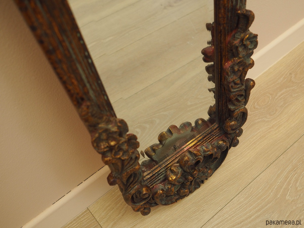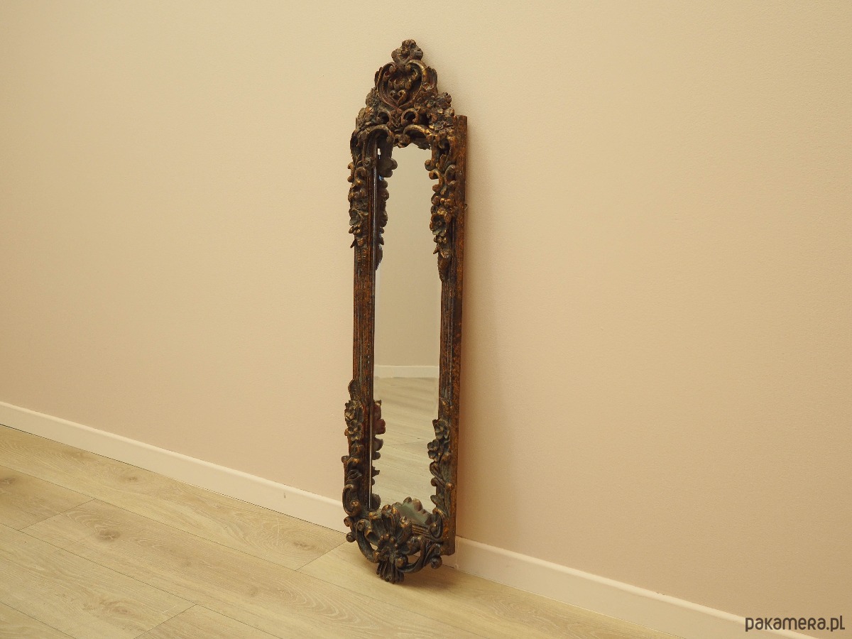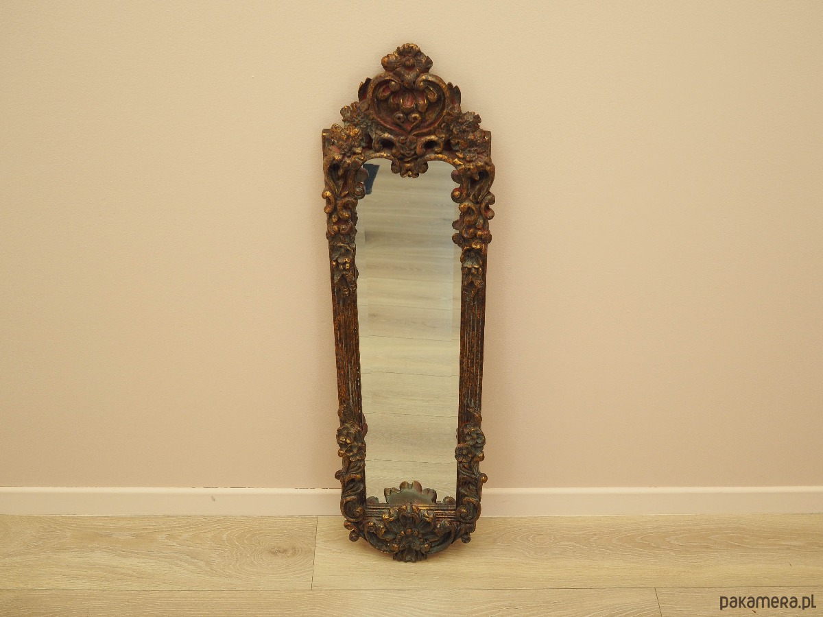 Rama lustra wykonana jest z litego drewna, rzeźbienia z gipsu. Rama po odświeżeniu. Bogato zdobiona forma nadaje wnętrzu niebanalnego charakteru.