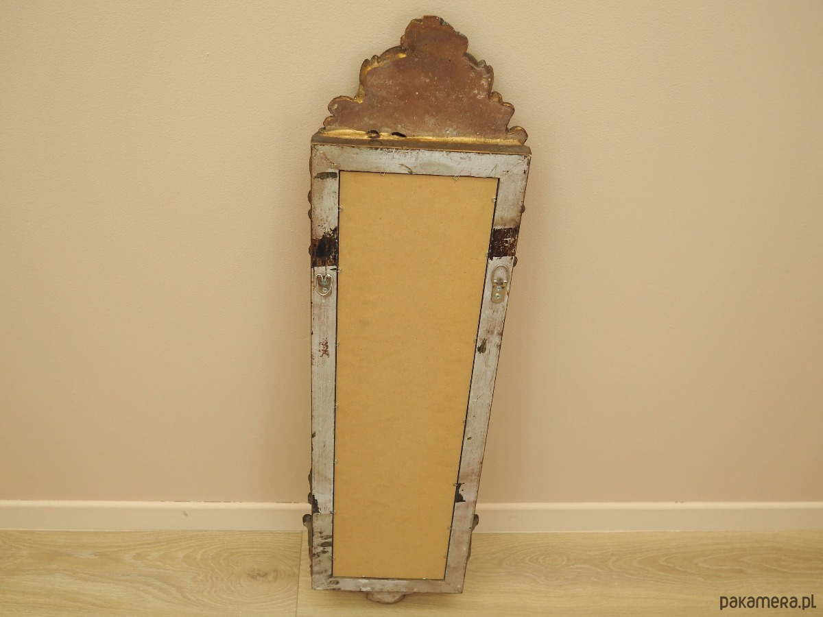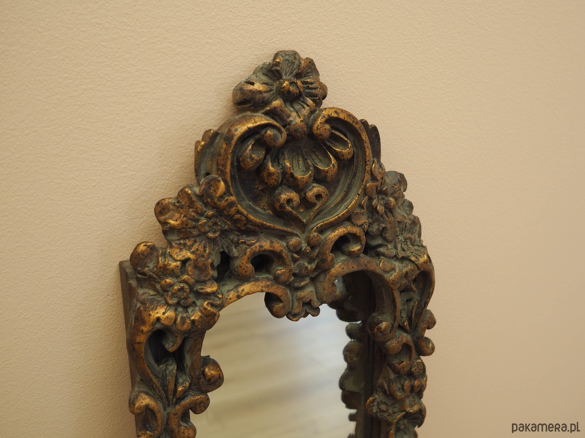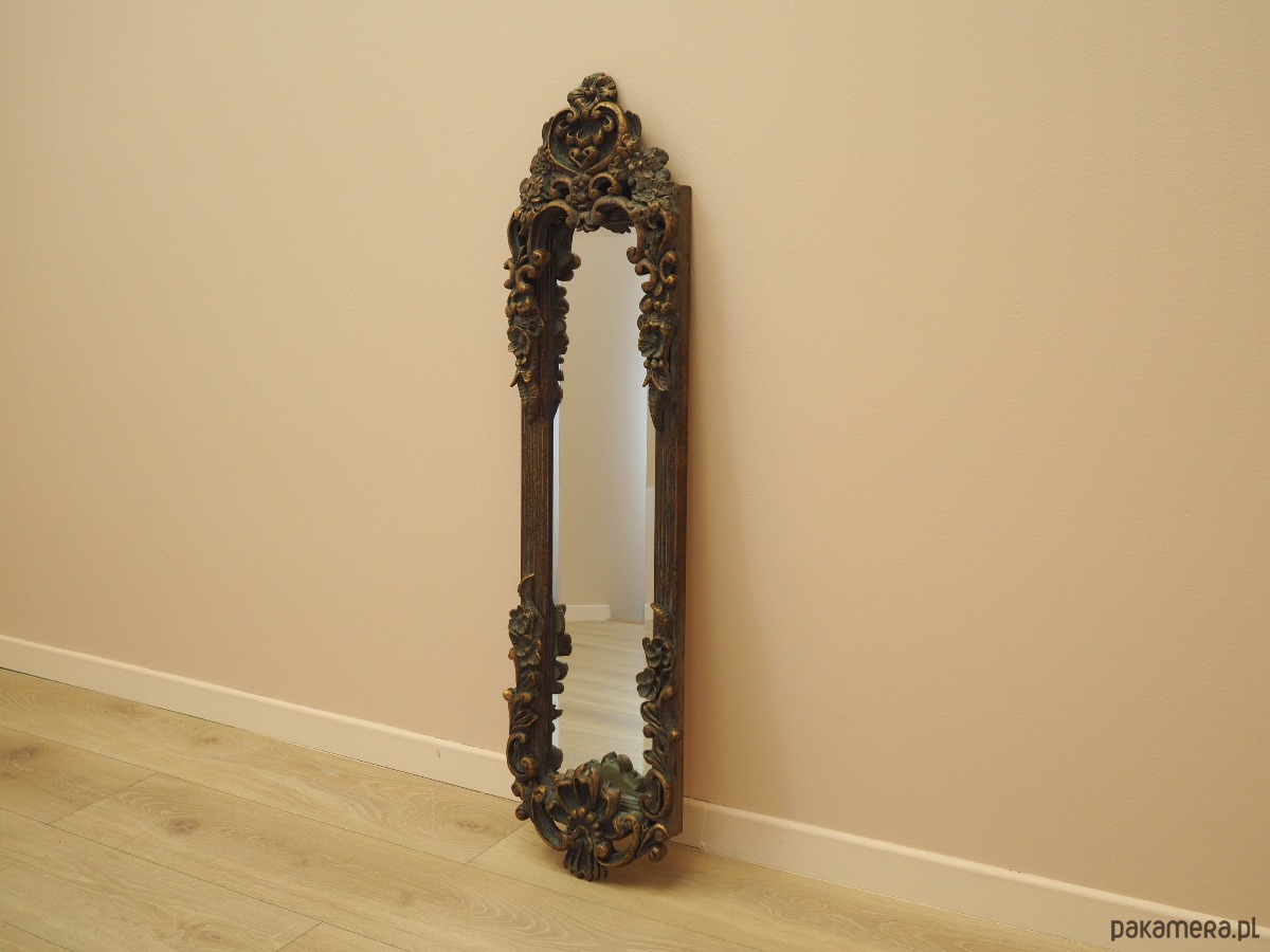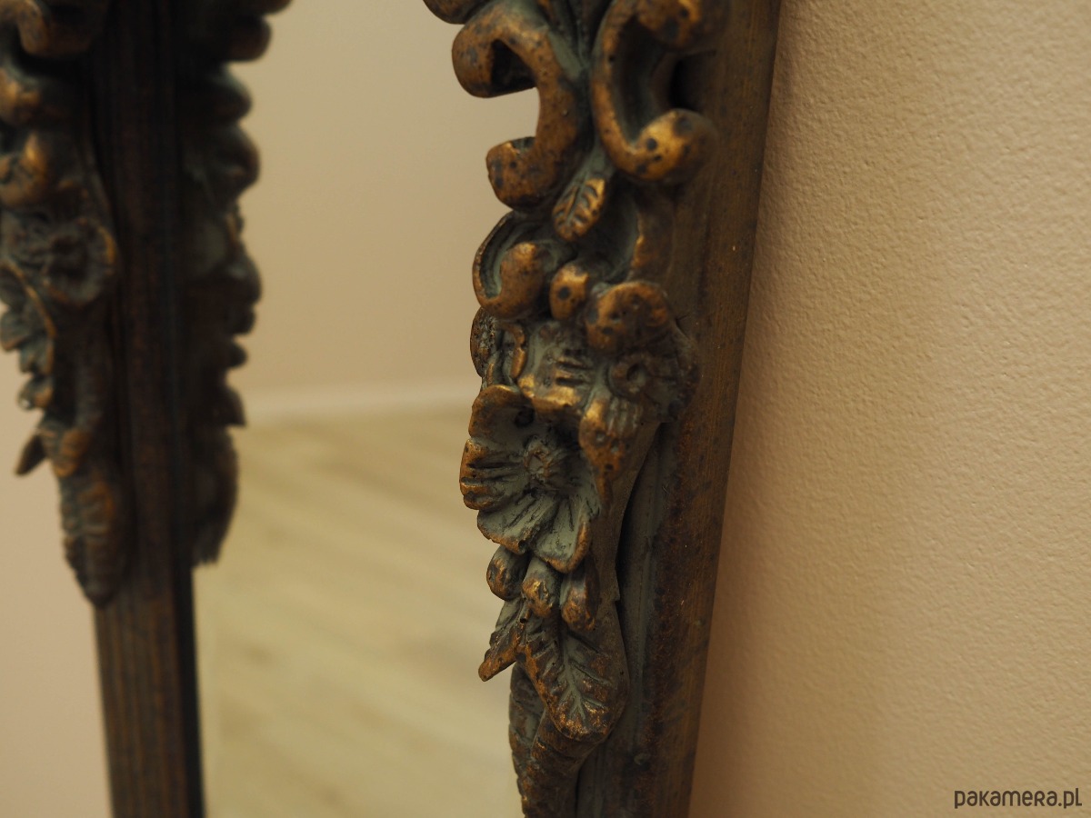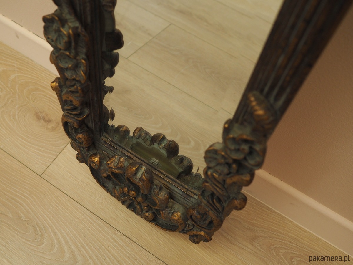 Rama lustra wykonana jest z litego drewna, rzeźbienia z gipsu. Rama po odświeżeniu. Bogato zdobiona forma nadaje wnętrzu niebanalnego charakteru.