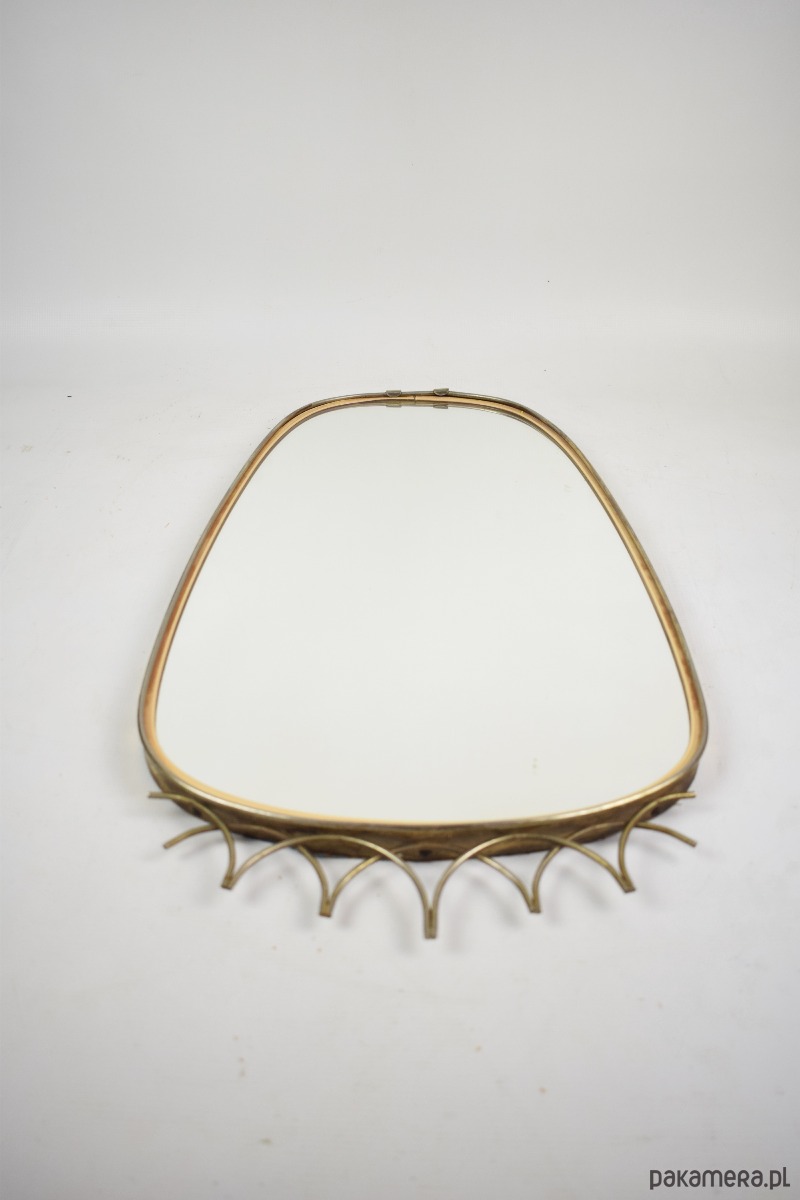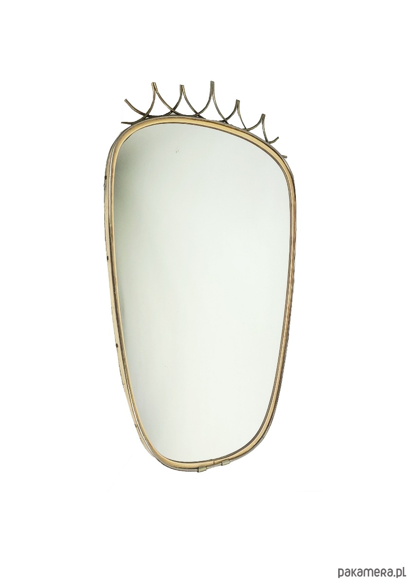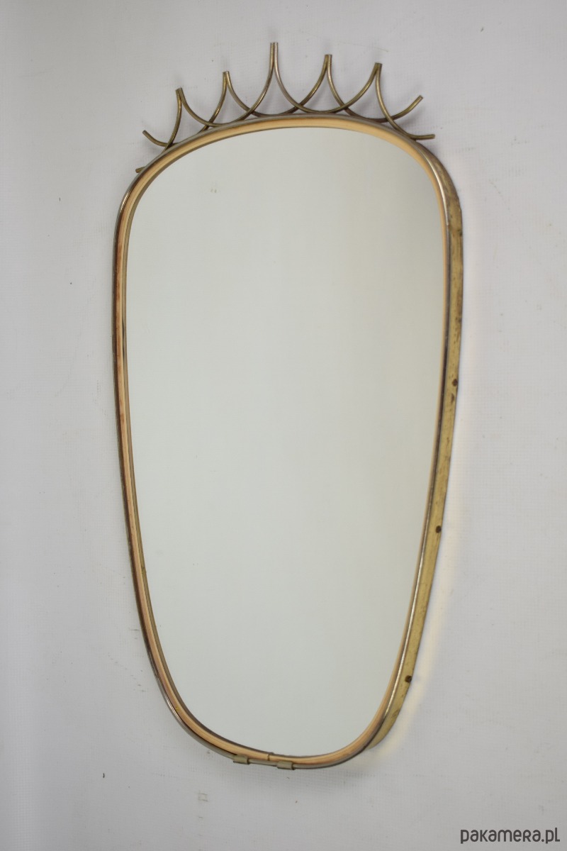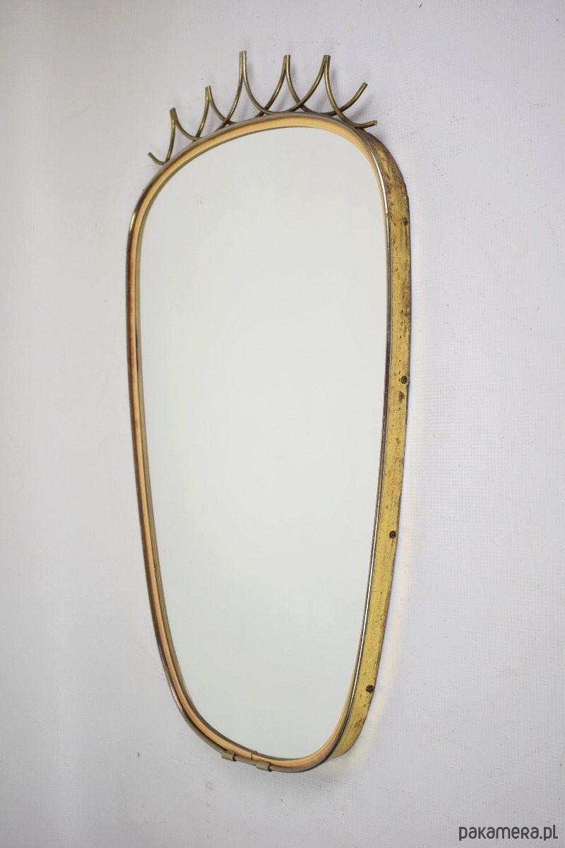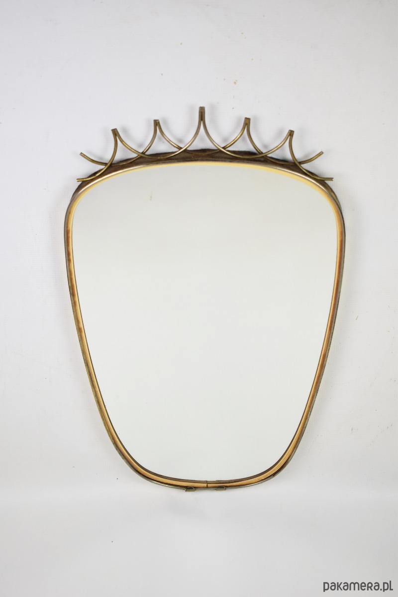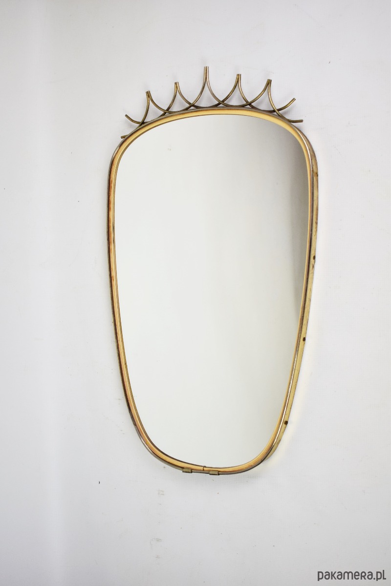 Lustro w stylu rockabilly z lat 60. Lustro w mosiężnej ramie z ozdobną koroną, w stanie dobrym posiada rysy i utlenienia, tył lustra zabezpieczony folią.