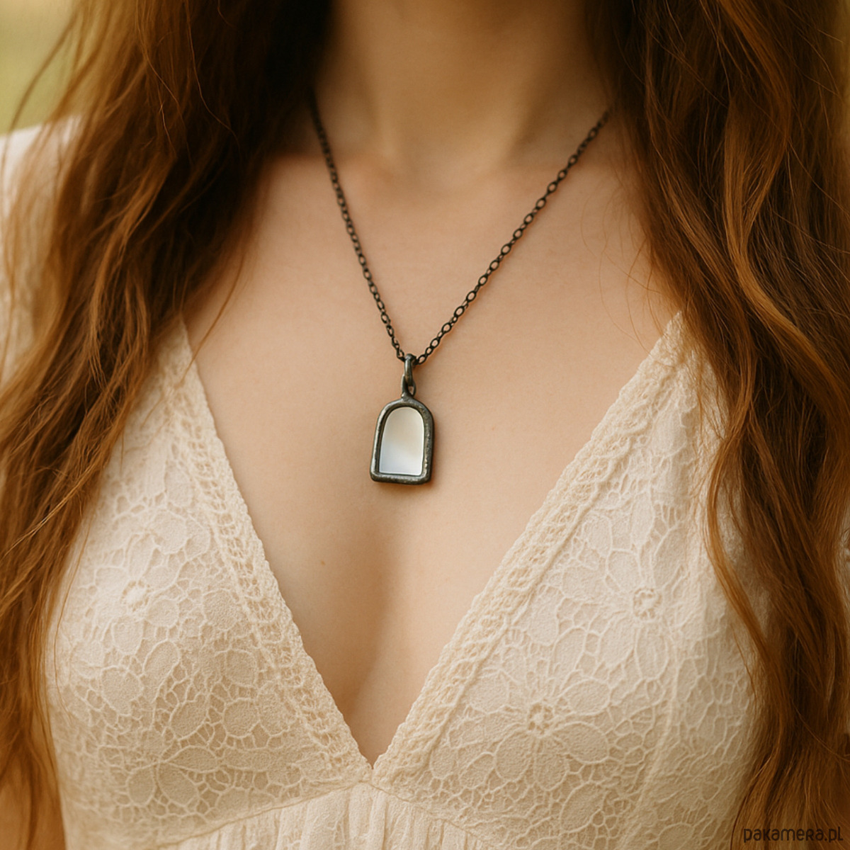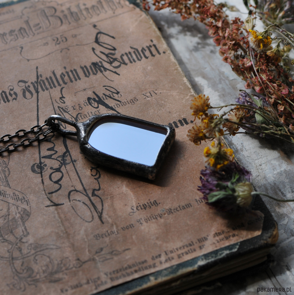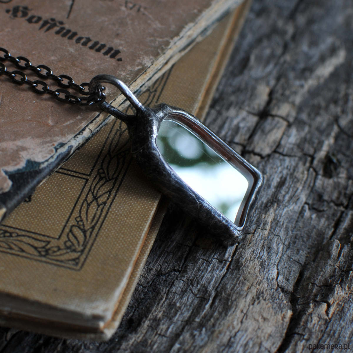 Delikatny, a jednocześnie wyrazisty naszyjnik z prawdziwym, szklanym lusterkiem w kształcie portalu – u góry łuk, u dołu prostokątne wykończenie. Lusterko oprawione jest w ręcznie wykonaną, artystyczną ramę stylizowaną na stare srebro, co nadaje mu niepowtarzalnego charakteru.