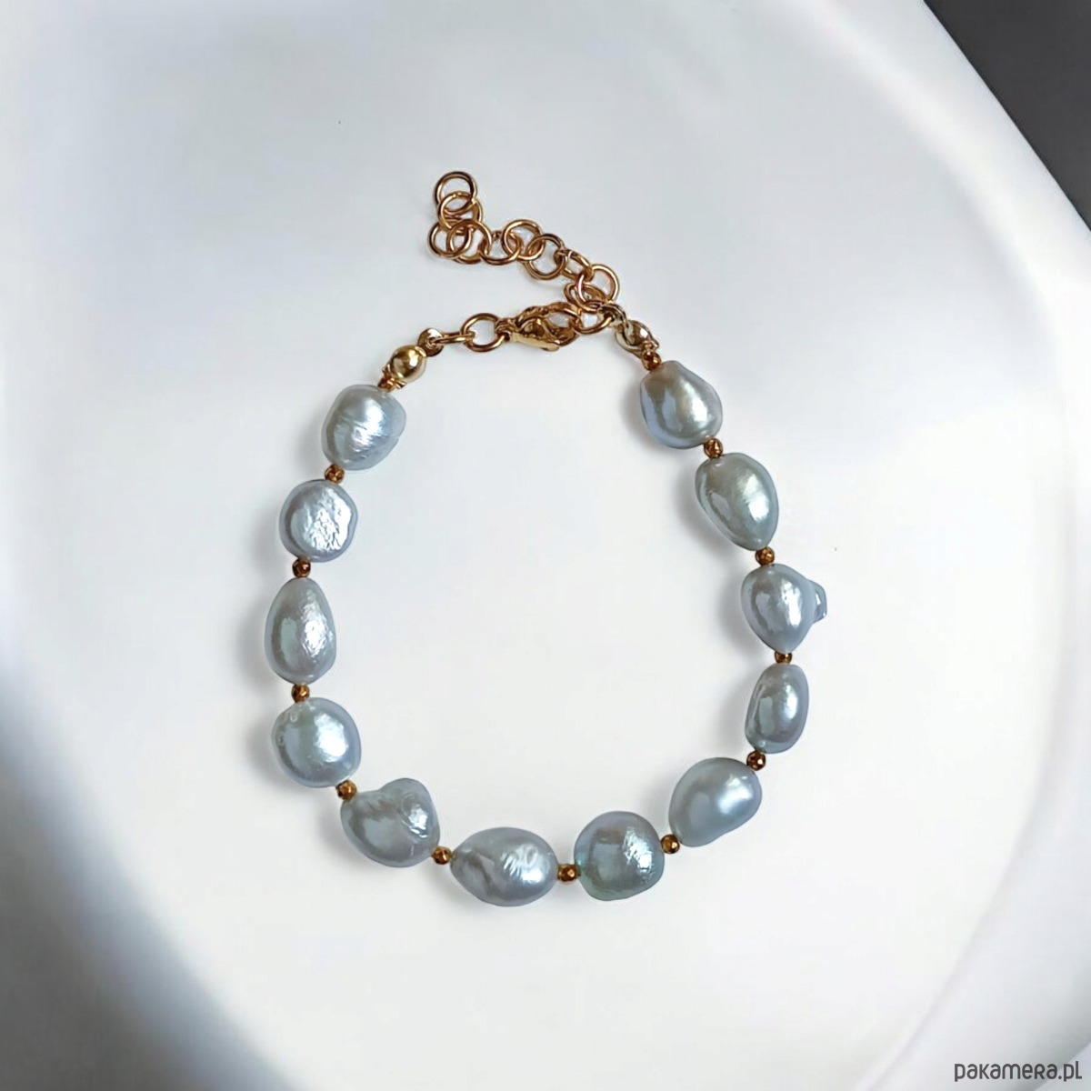Zjawiskowa bransoletka wykonana z pięknych, mocno nieregularnych pereł naturalnych, słodkowodnych w kolorze SREBRNYM oraz drobniutkich, fasetowanych kuleczek złotego hematytu 1,8mm.