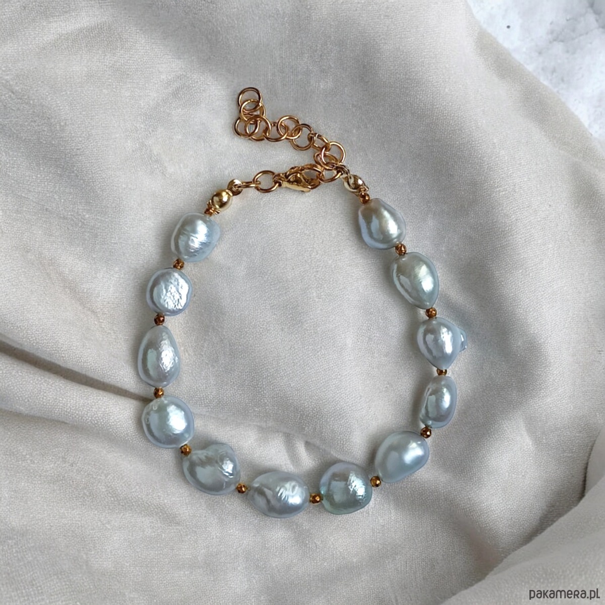 Zjawiskowa bransoletka wykonana z pięknych, mocno nieregularnych pereł naturalnych, słodkowodnych w kolorze SREBRNYM oraz drobniutkich, fasetowanych kuleczek złotego hematytu 1,8mm.